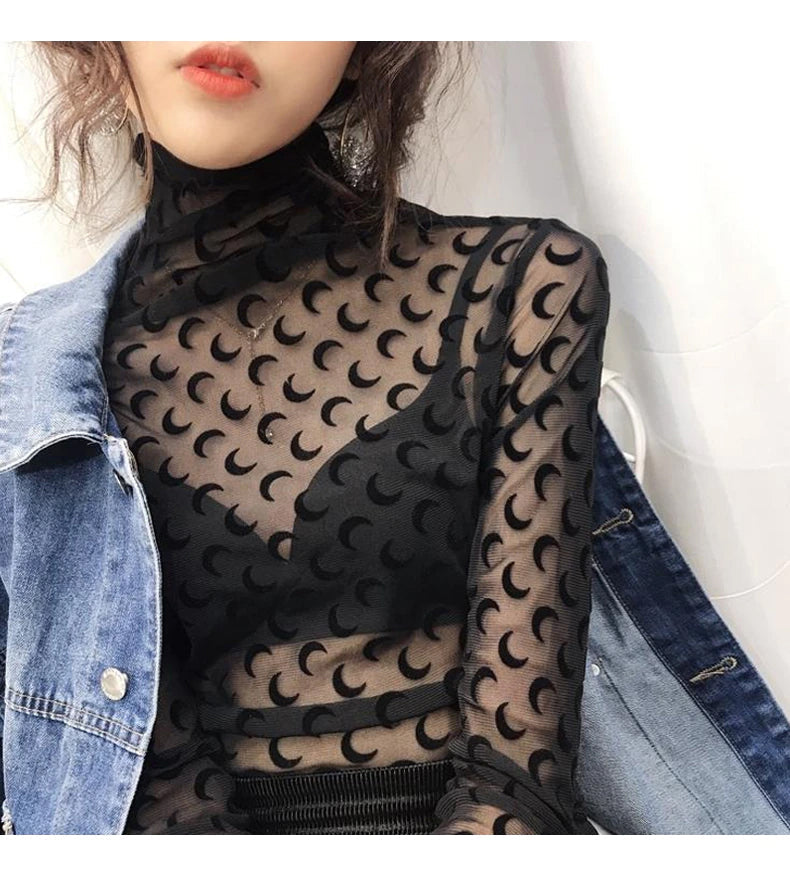 Sexy Long Sleeve Moon Pattern See Through Turtleneck Shirt