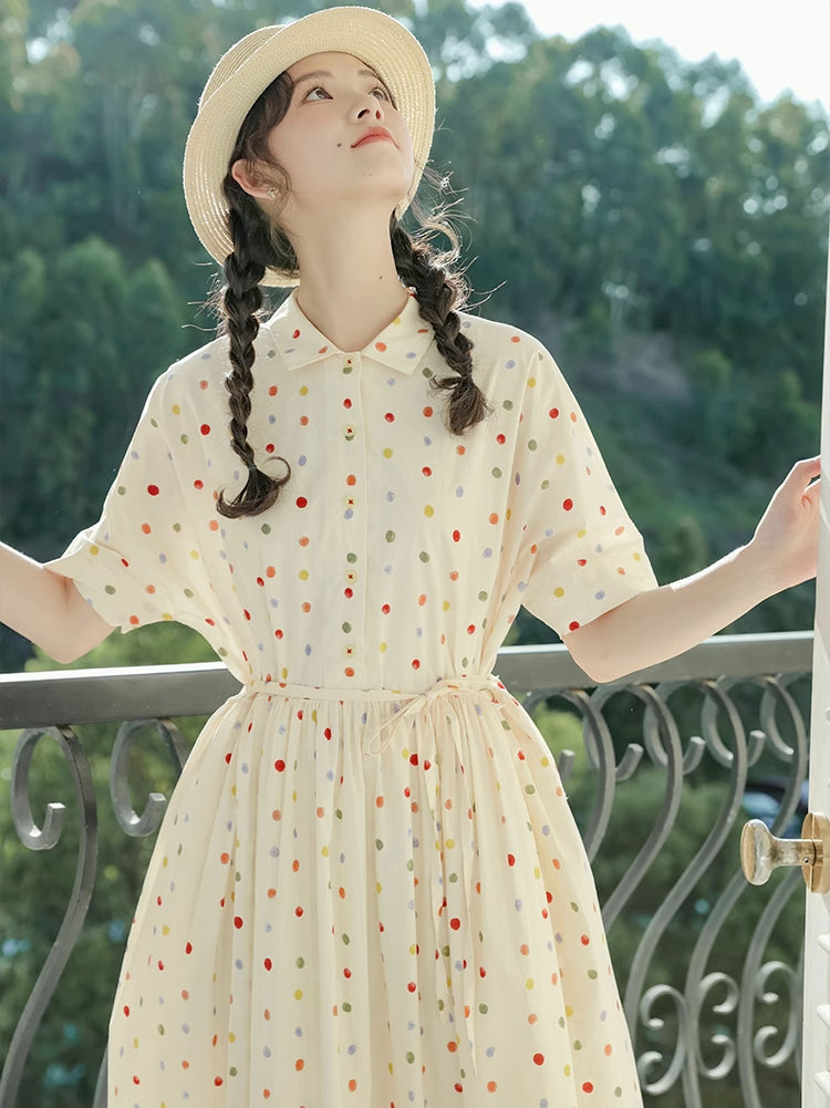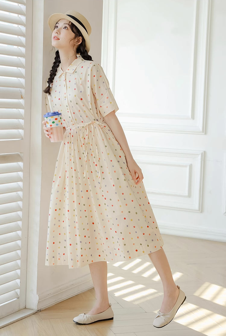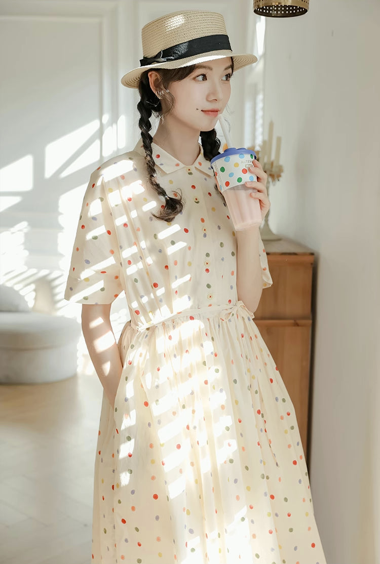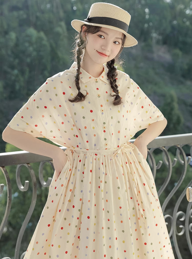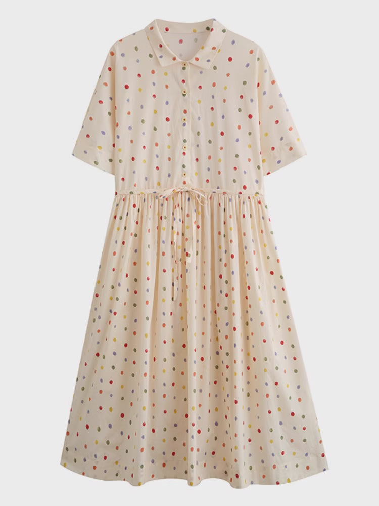 Bring a touch of nostalgia and playfulness to your wardrobe. This piece boasts a vibrant polka dot pattern. a button-up front. short slouchy sleeves. flared waist with waist-ties. side pockets. and a midi-length skirt. It's fully lined for a comfy fit.