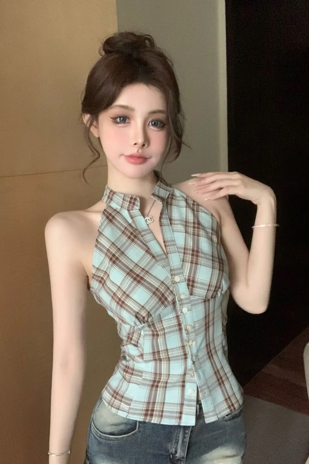 Buy Sleeveless Off Shoulder Plaid Blouse Shirt from Omcne for your outfit of the day. This item is in stock and ready to order. World Wide Shipping Service. Check our Shop for more trendy fashion.