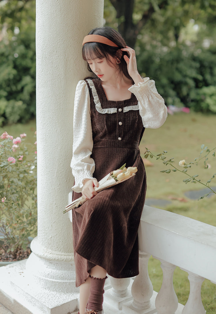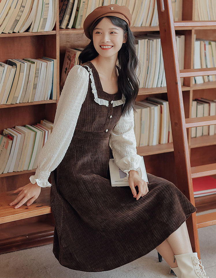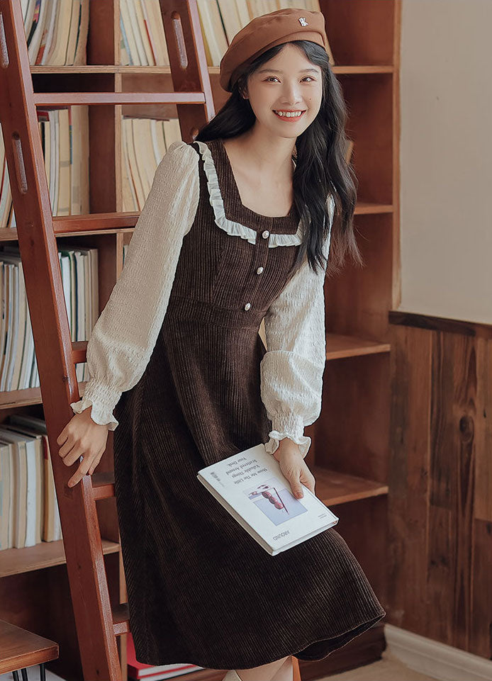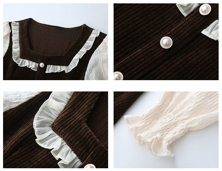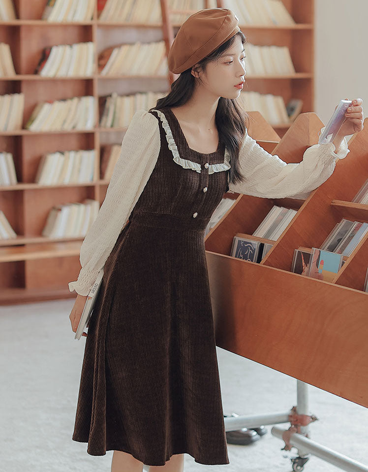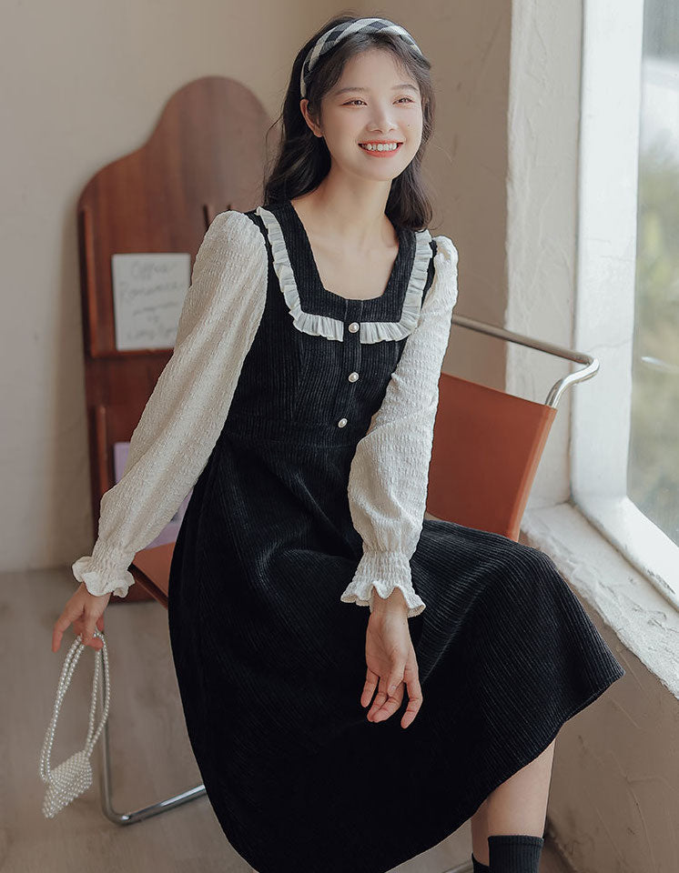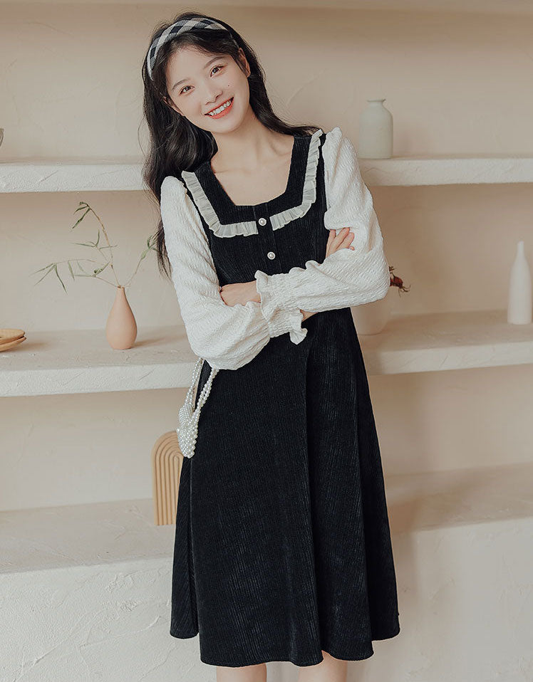 Thick corduroy ribbed sweater dress in a midi length with a square neckline. ruffle details and chiffon blouson sleeves. Elastic waist back.