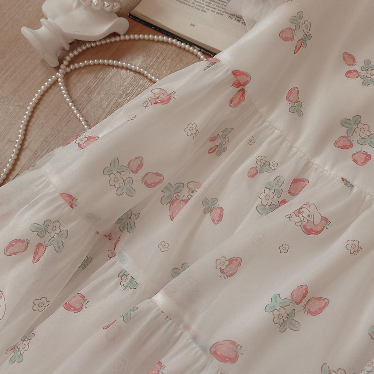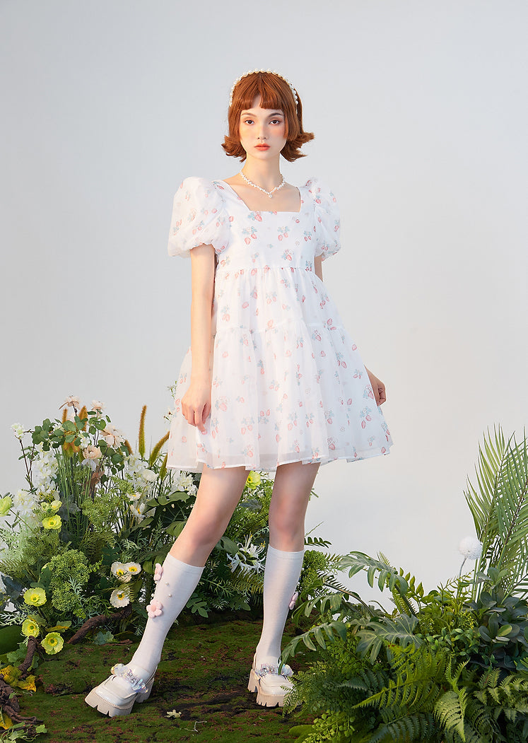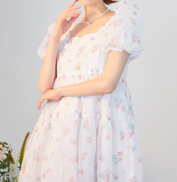 Tiered babydoll puff dress with a square neckline and short puff sleeves. Lined.