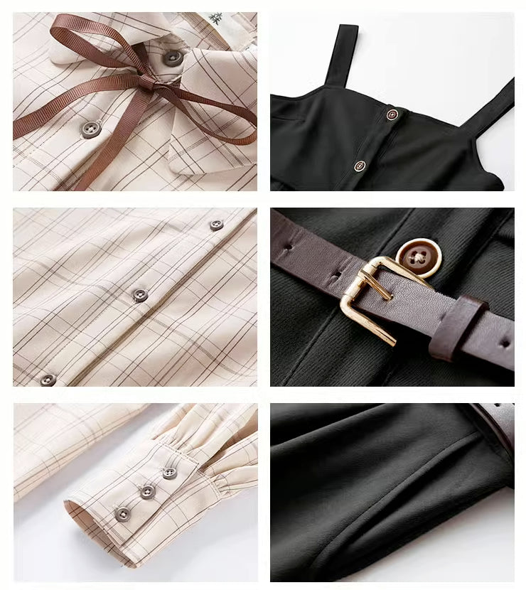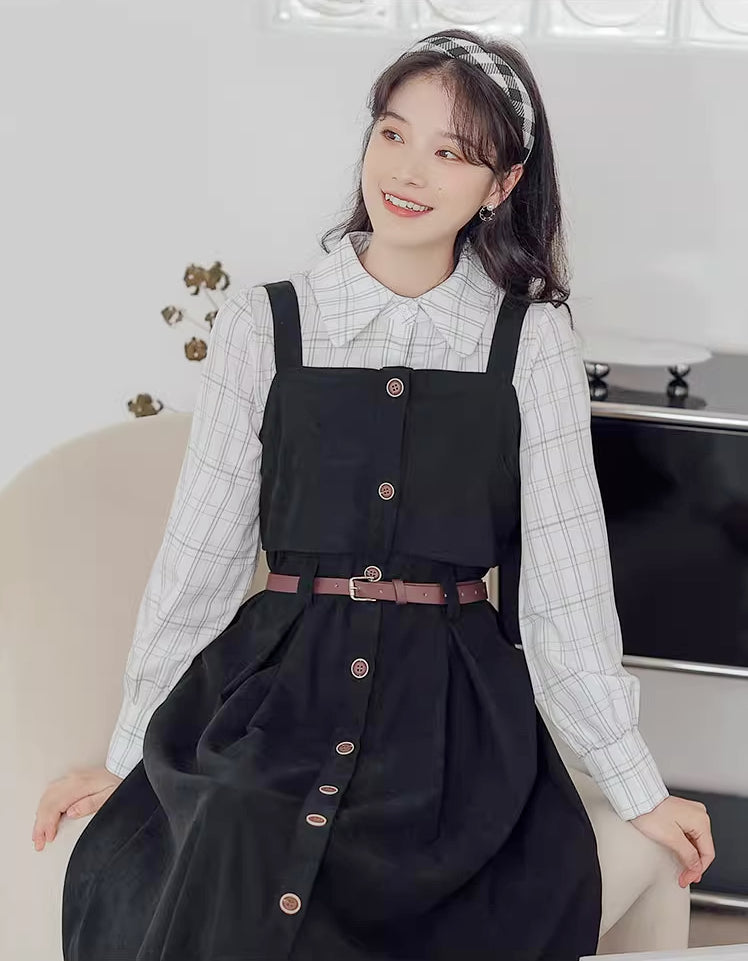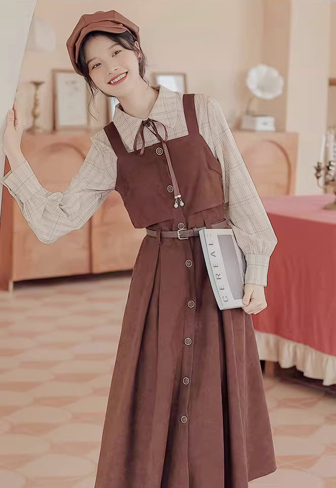 A blouse and pinafore dress set for easy mix & matching. The blouse is in a neutral grid plaid pattern with a classic collar. ribbon piece and button down front. The dress features a square neckline with thick cami straps. button down front. belted waist. side pockets and midi skirt in a corduroy suede fabric. Lined. Belt included.