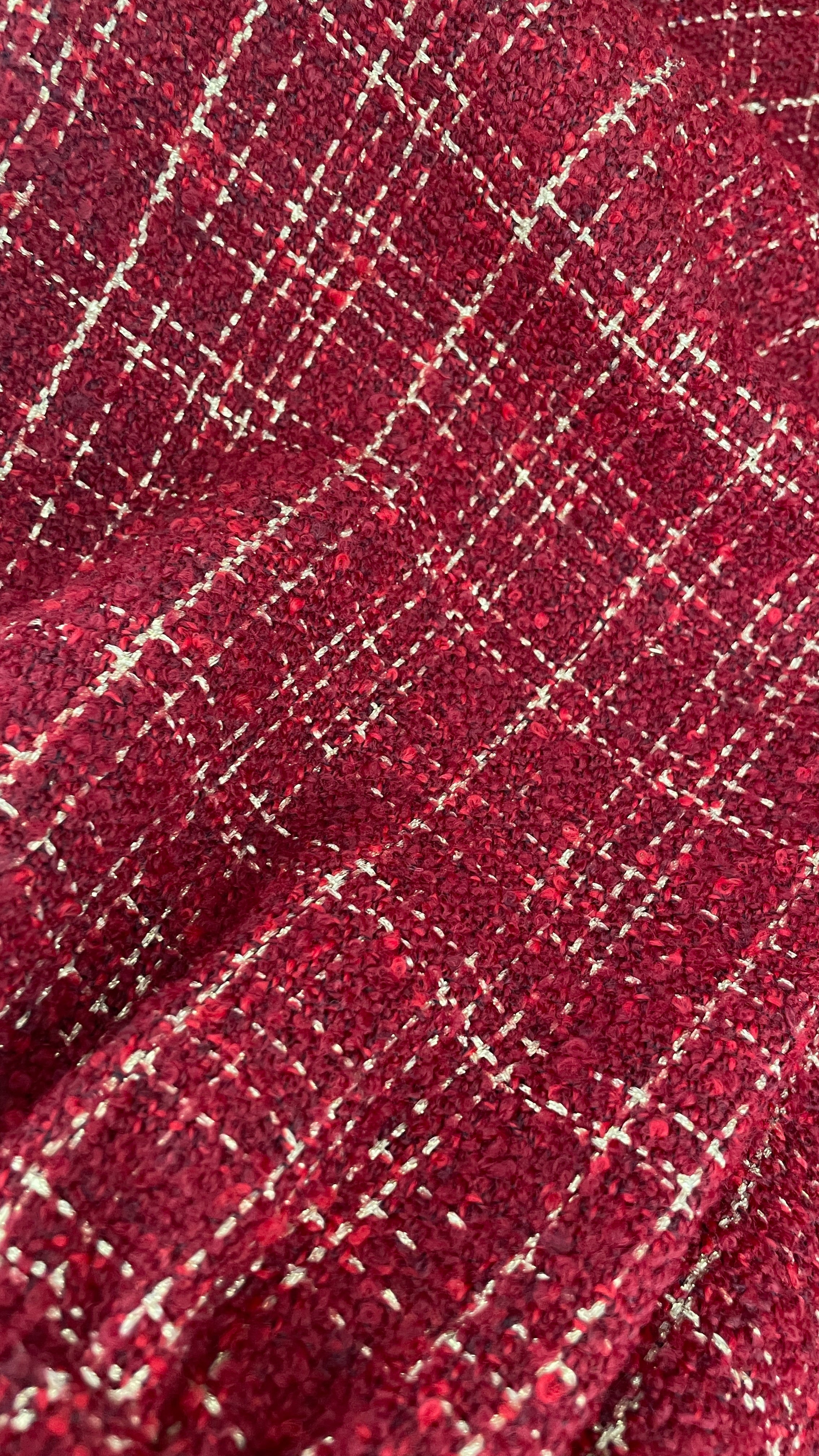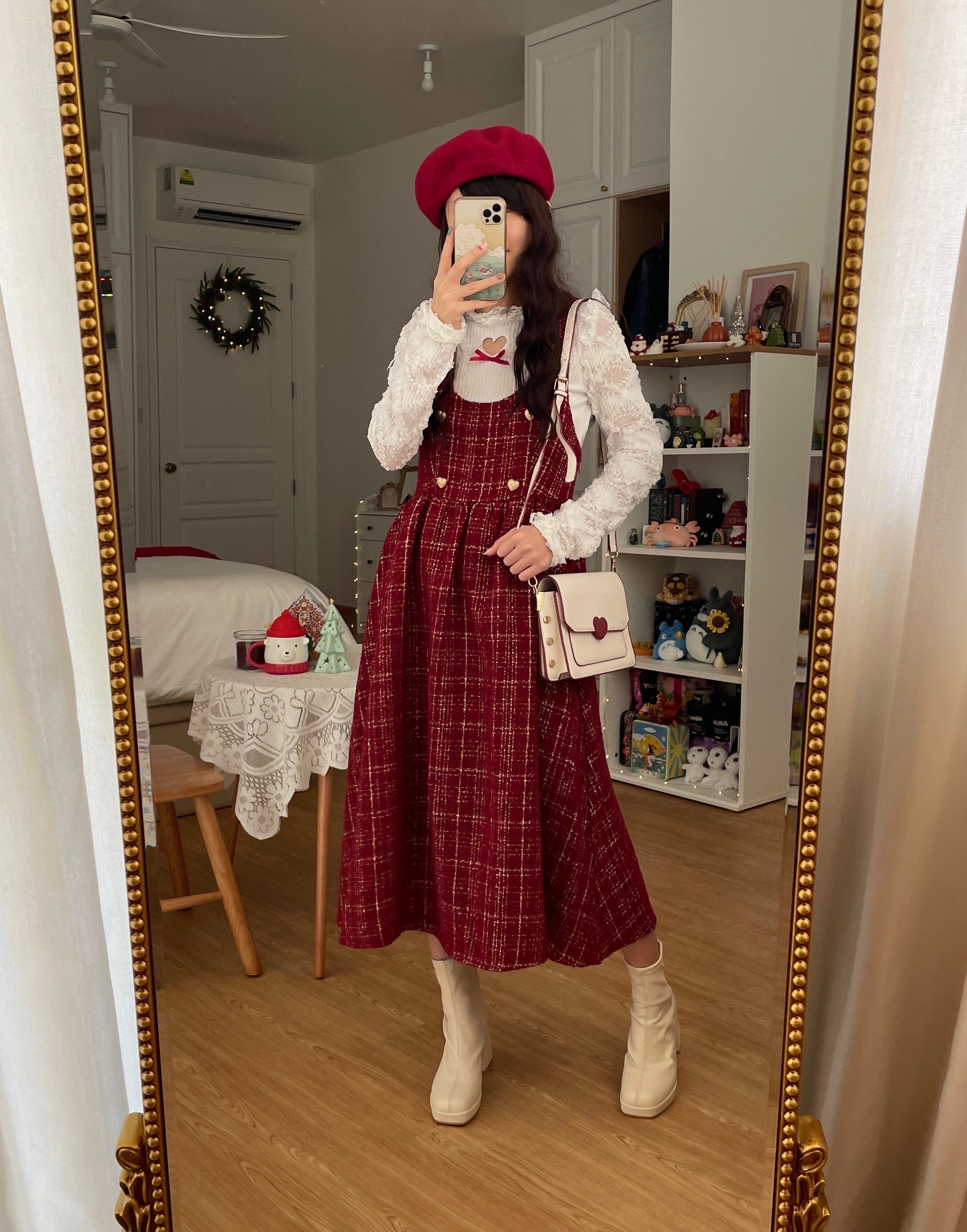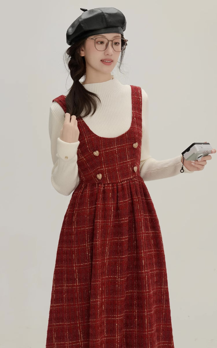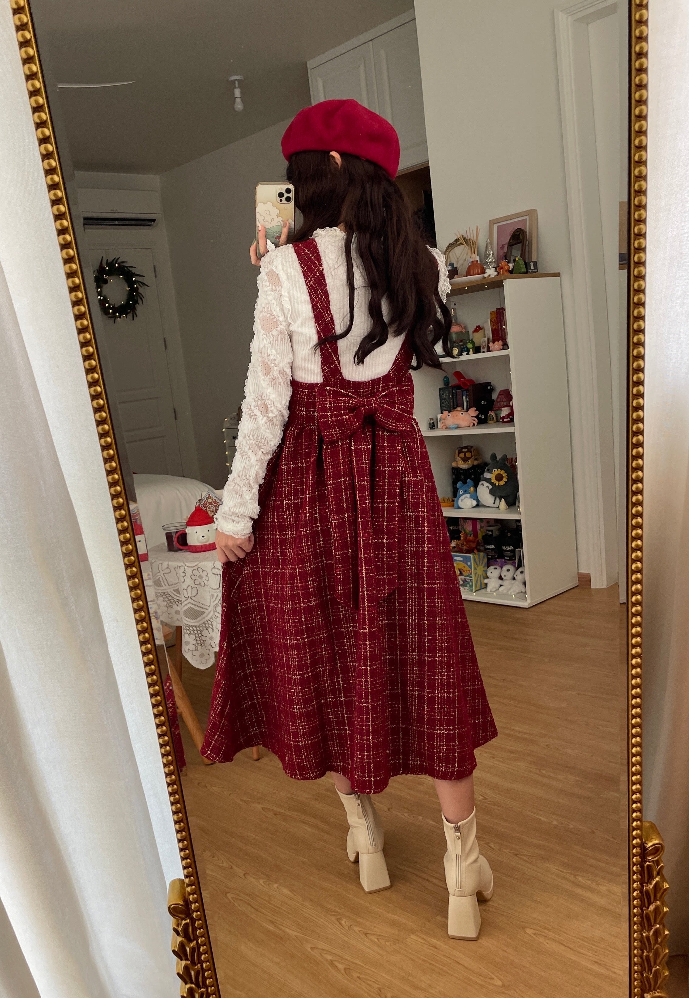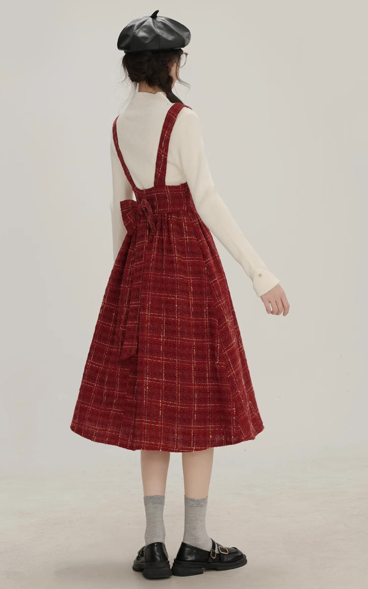 The sweetest little apple in town. This pinafore dress features a scoop neckline and thick shoulder straps for layering. heart buttons on the chest. cinched waist with a big bow behind. and a midi length skirt on a plaid tweed fabric. Opens easily with a concealed side zipper.