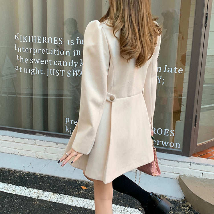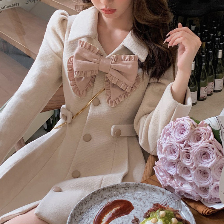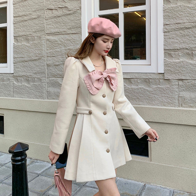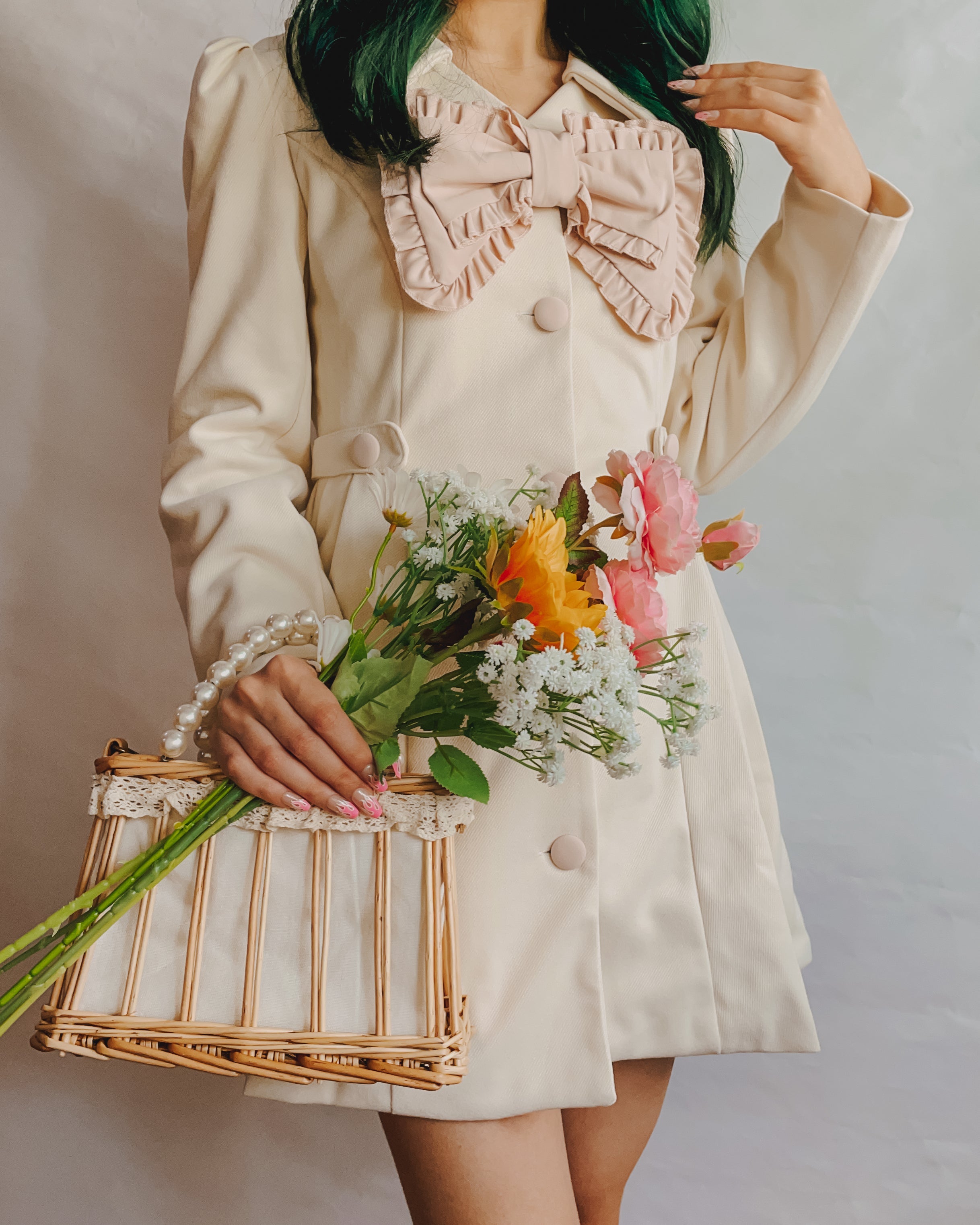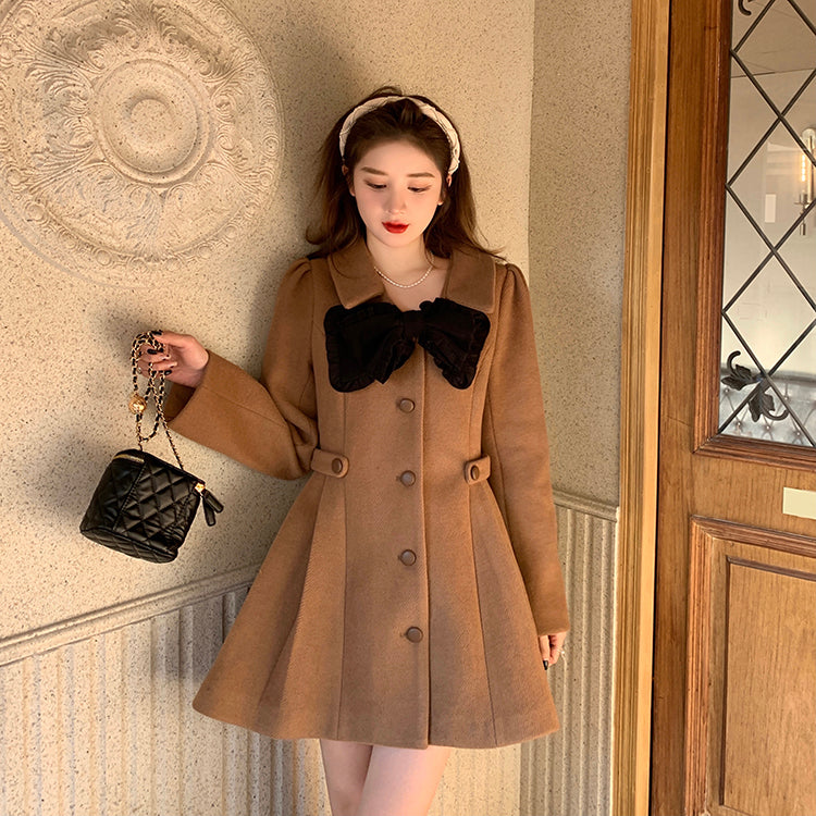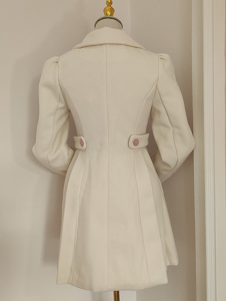 Chic and sweet faux wool-blend button up coat with puff shoulders. cinched waist and a pleated flare skirt. Clip-on bow that can be worn on your coat or as a hair accessory. Quilted lining and lightly padded.