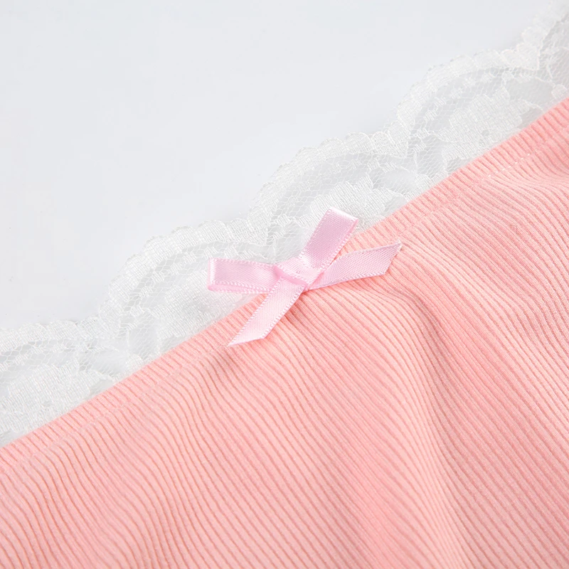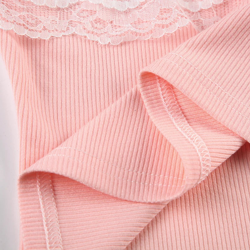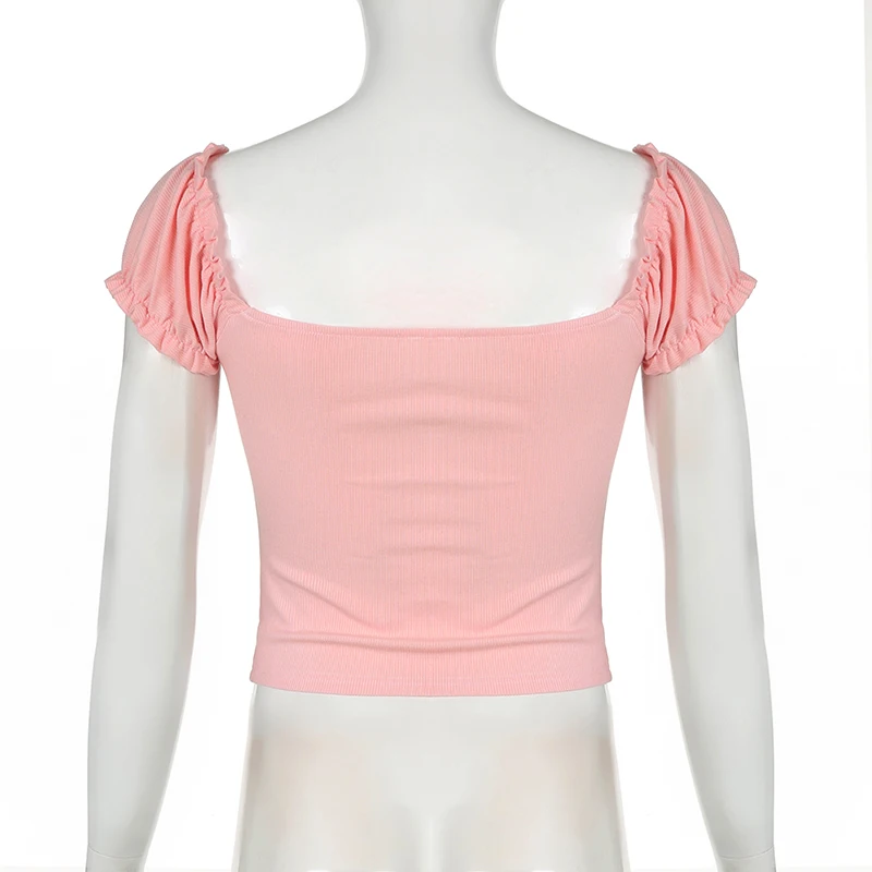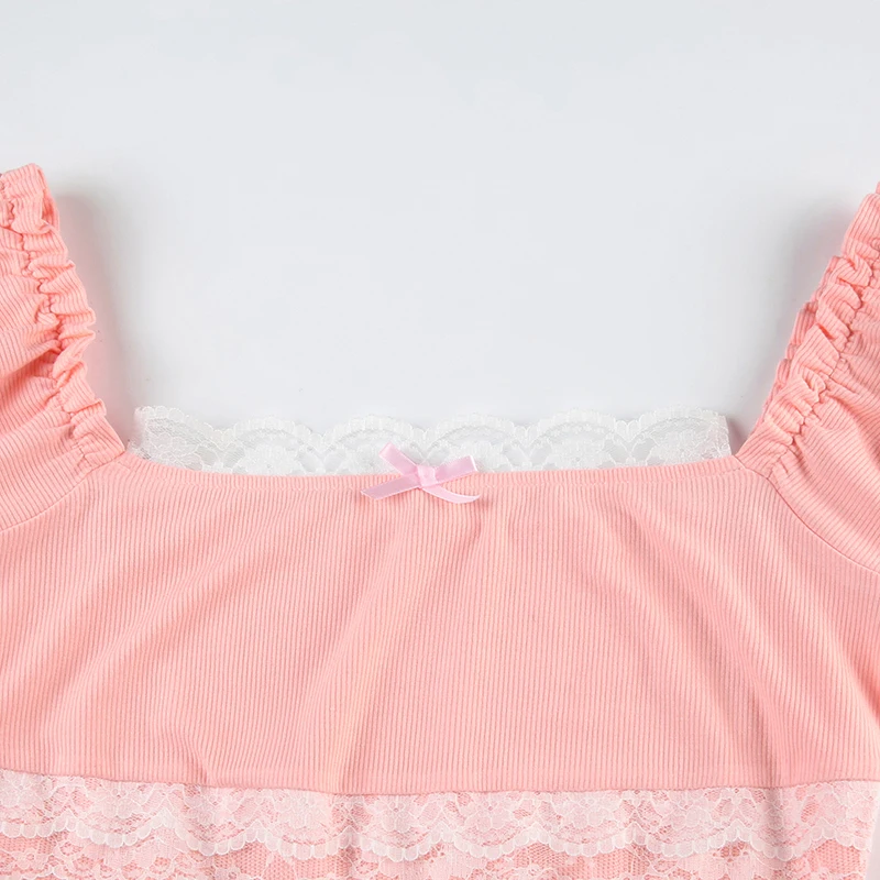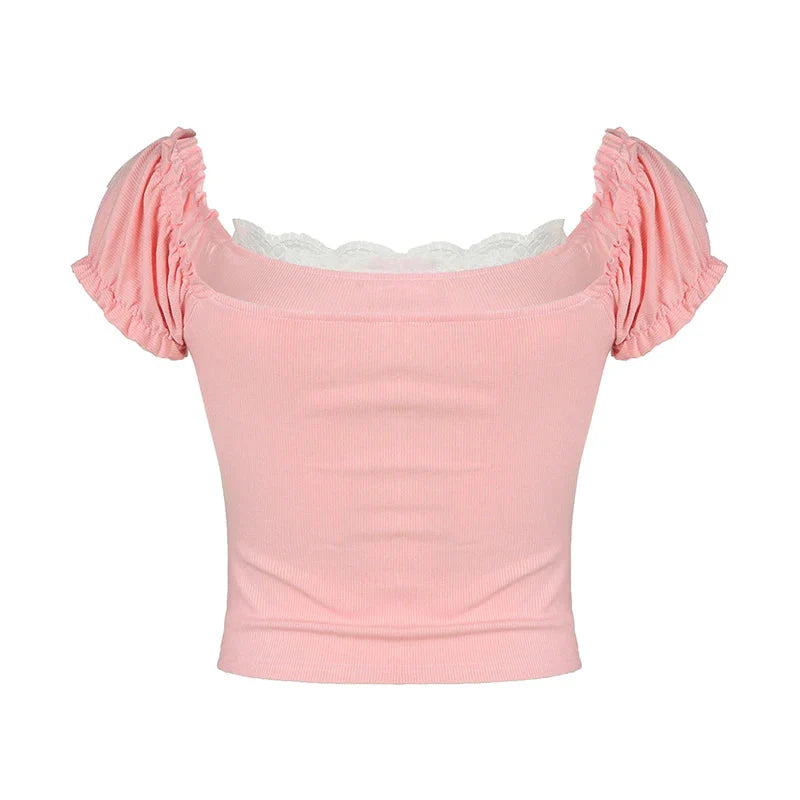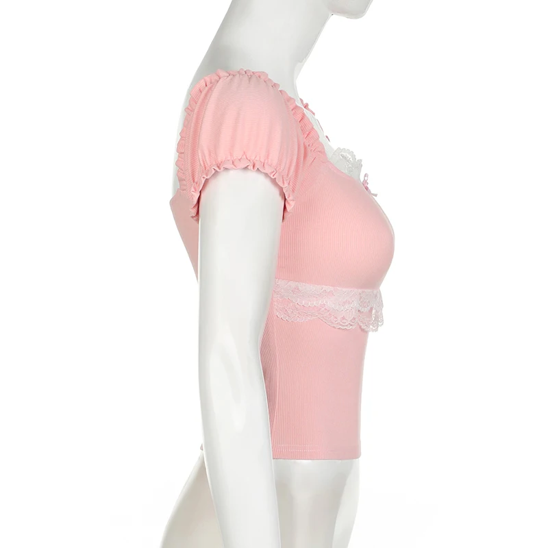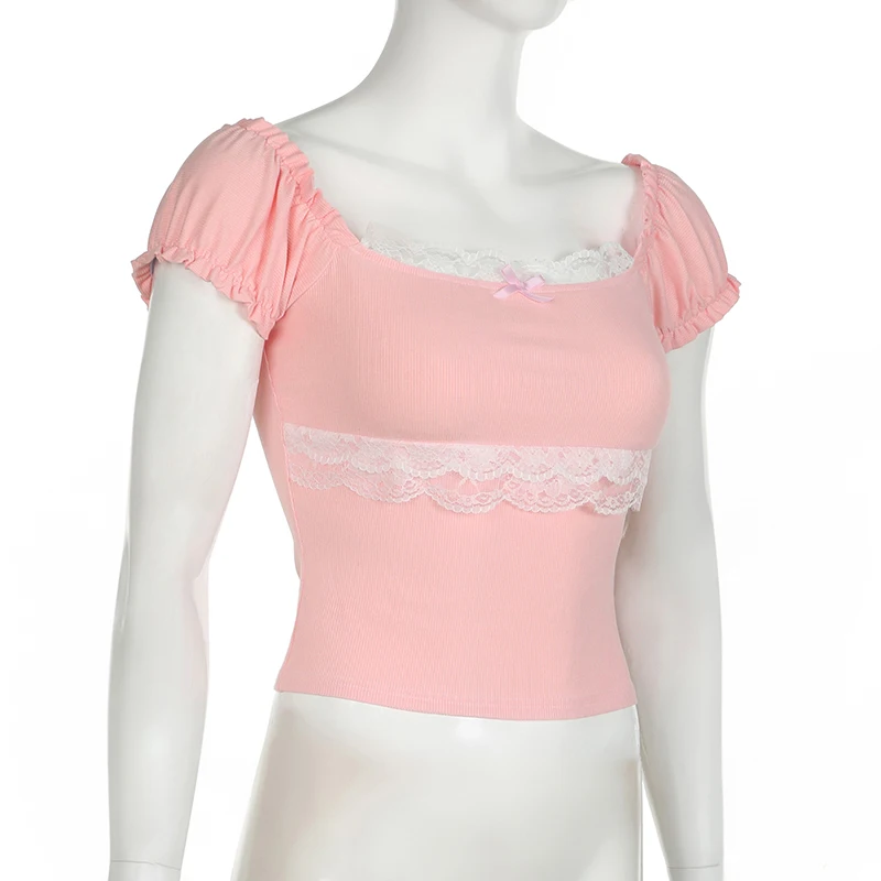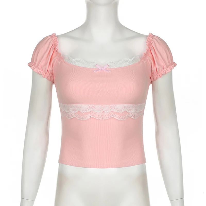 Sweet Coquette Crop Top Lace Patchwork Square Collar Skinny Pink T Shirts Women Vintage 2000s Puff Sleeve Tees Kawaii y2k