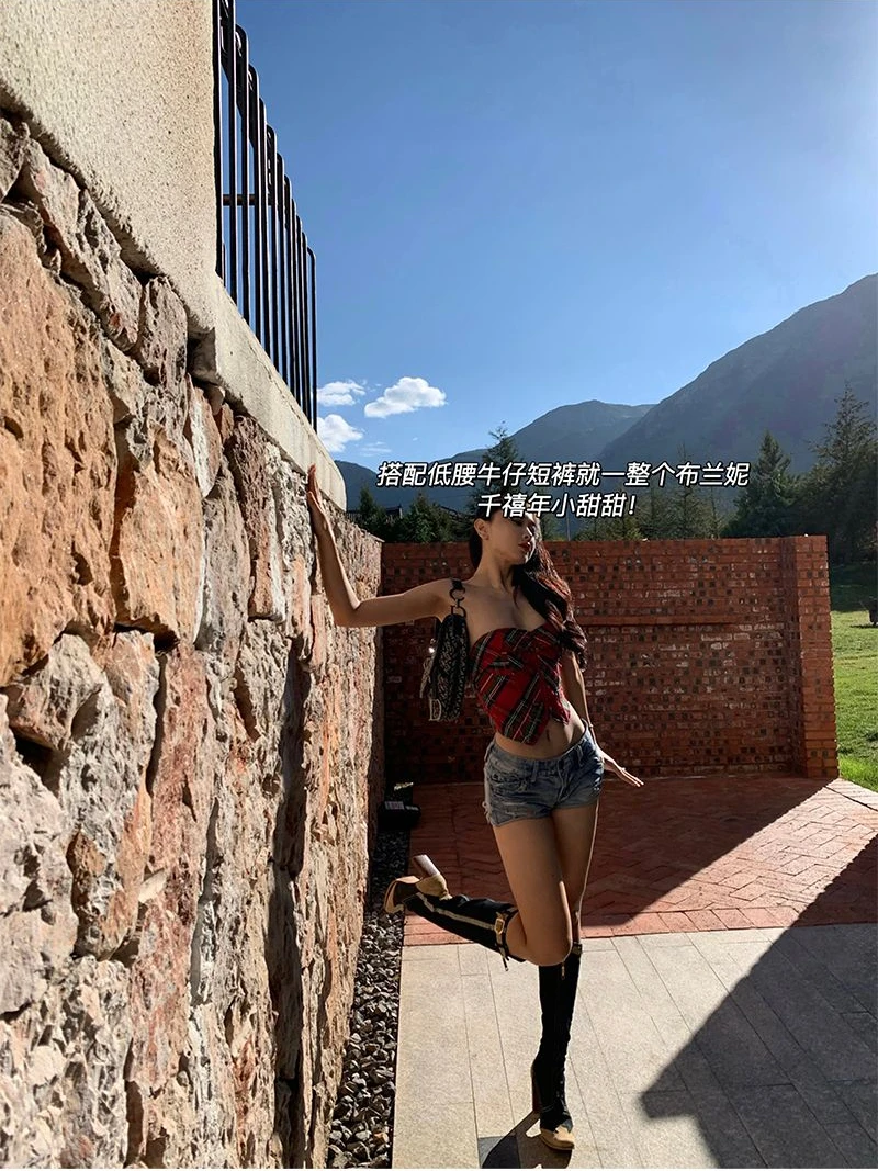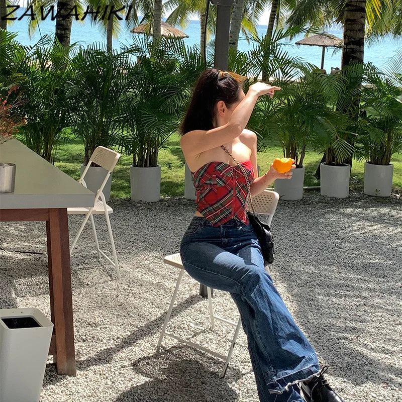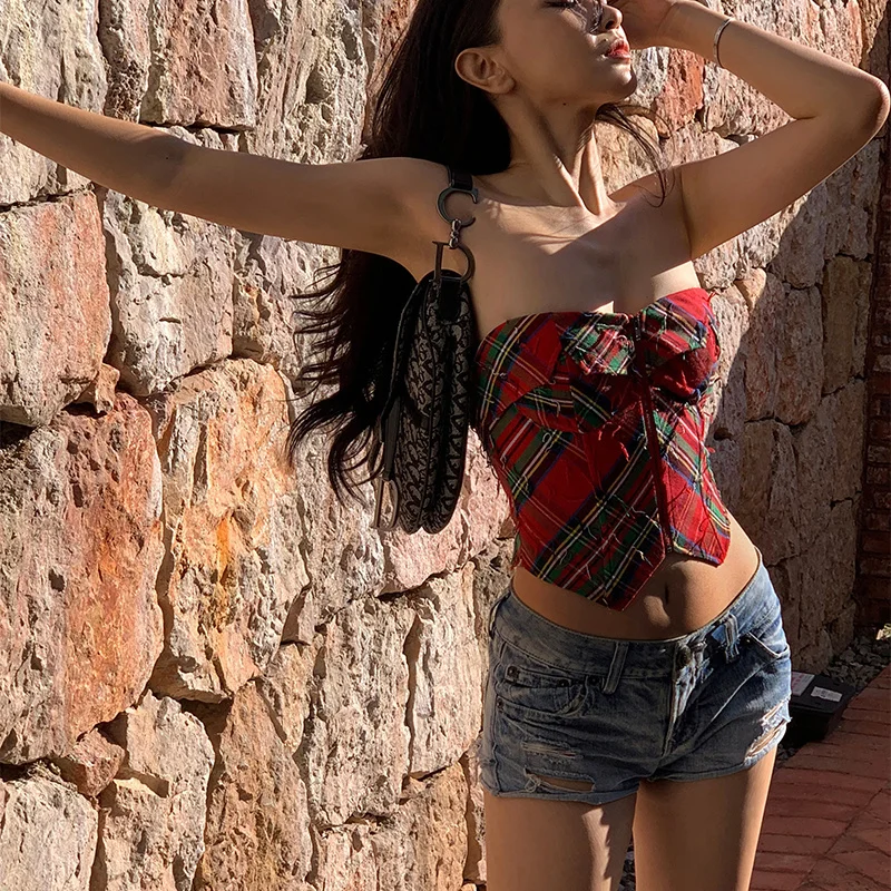 Tank Top Women American Retro Strapless Tube Slim Y2K Aesthetic Zipper Designed Fashion Vintage Plaid Patchworl Streetwear