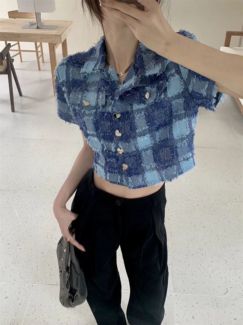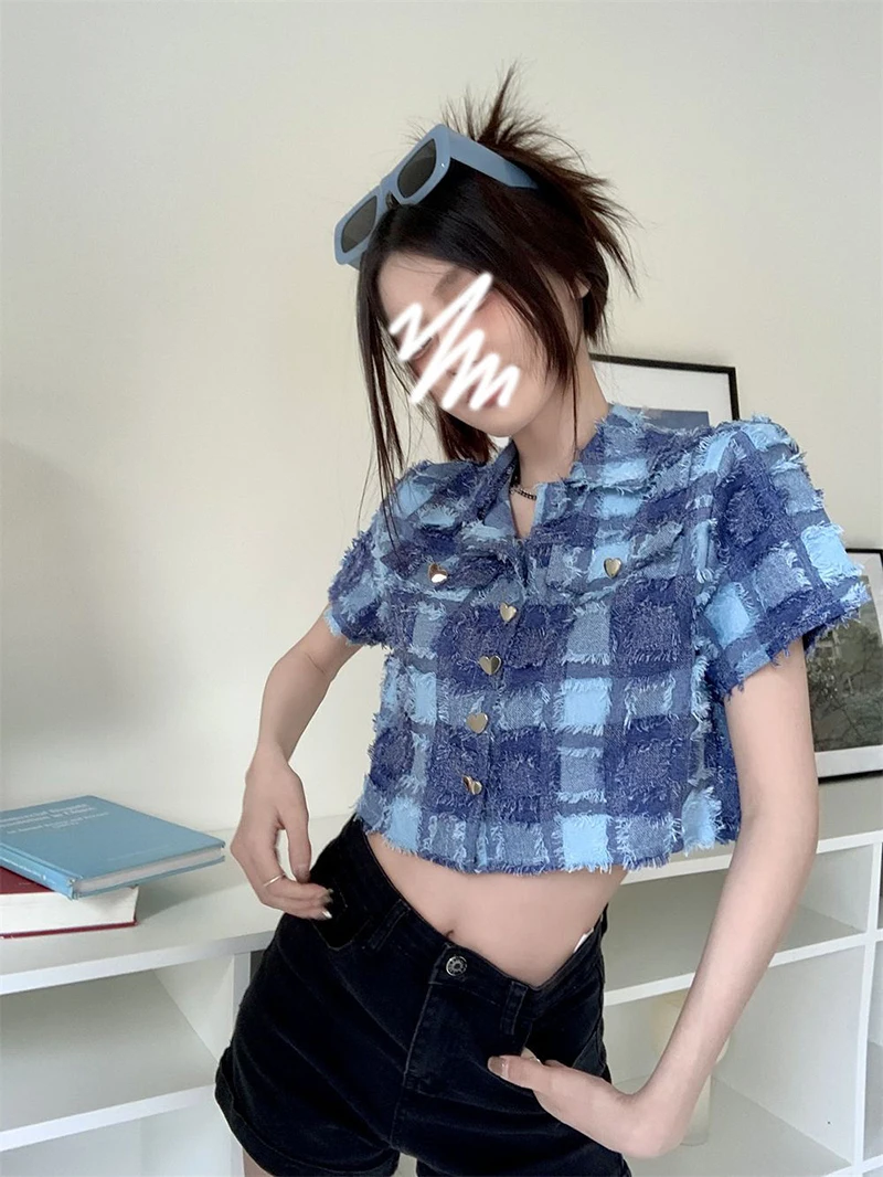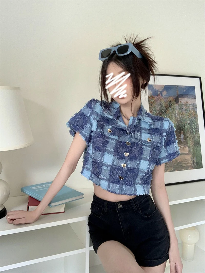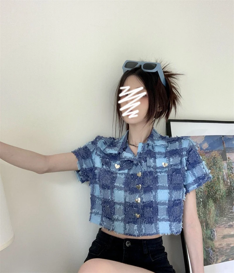 Tassel Cropped Plaid Shirt Women Vintage Streetwear Short Sleeve Sexy Blouse Casual Retro American Summer Short Y2K Tops