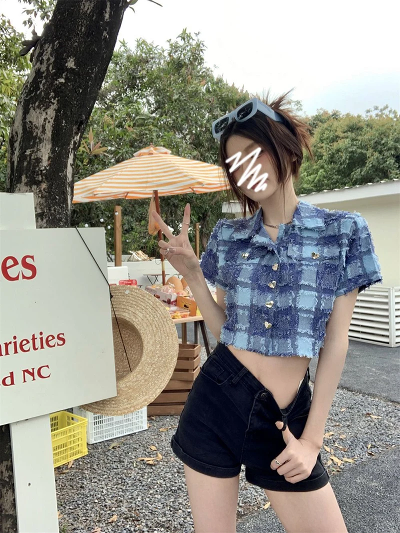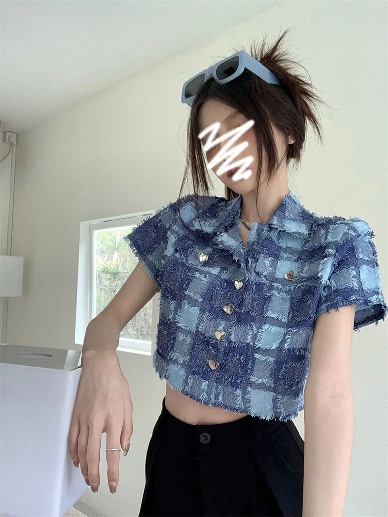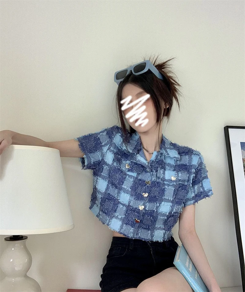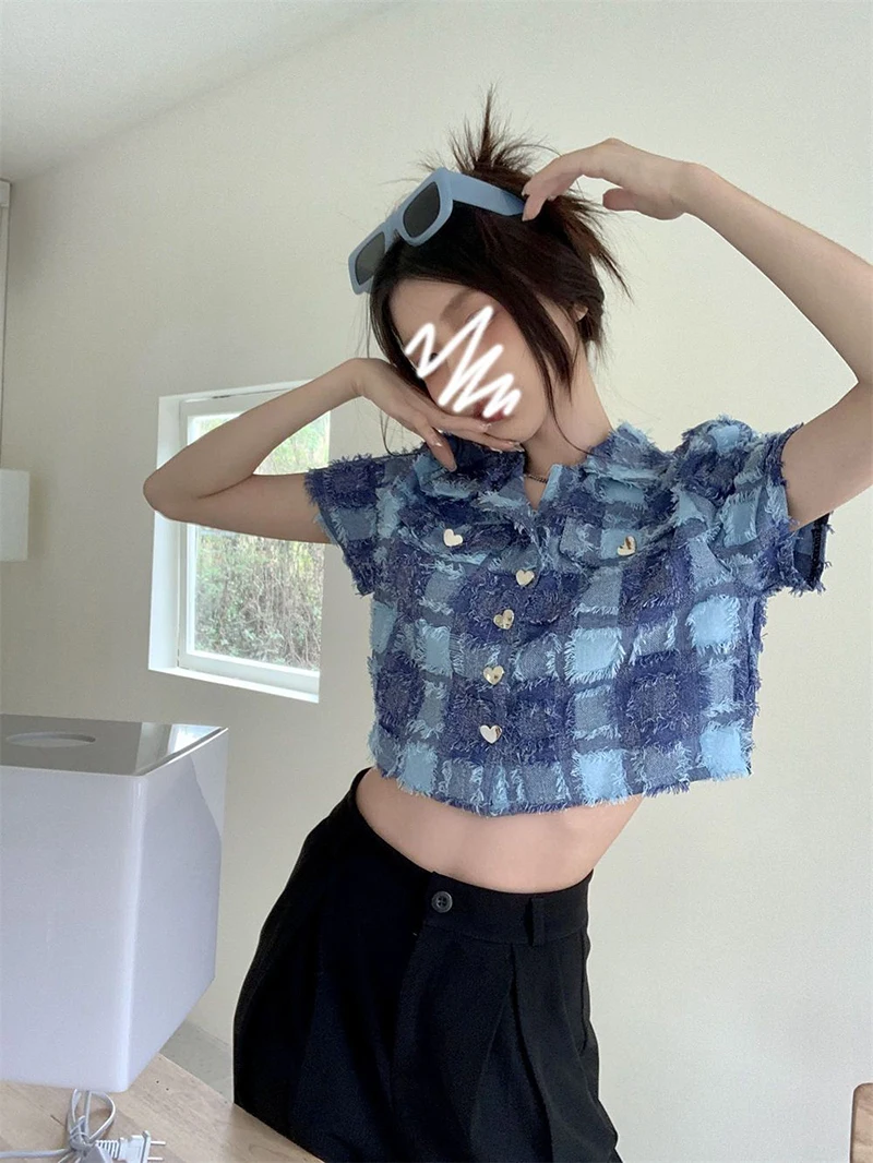 Tassel Cropped Plaid Shirt Women Vintage Streetwear Short Sleeve Sexy Blouse Casual Retro American Summer Short Y2K Tops