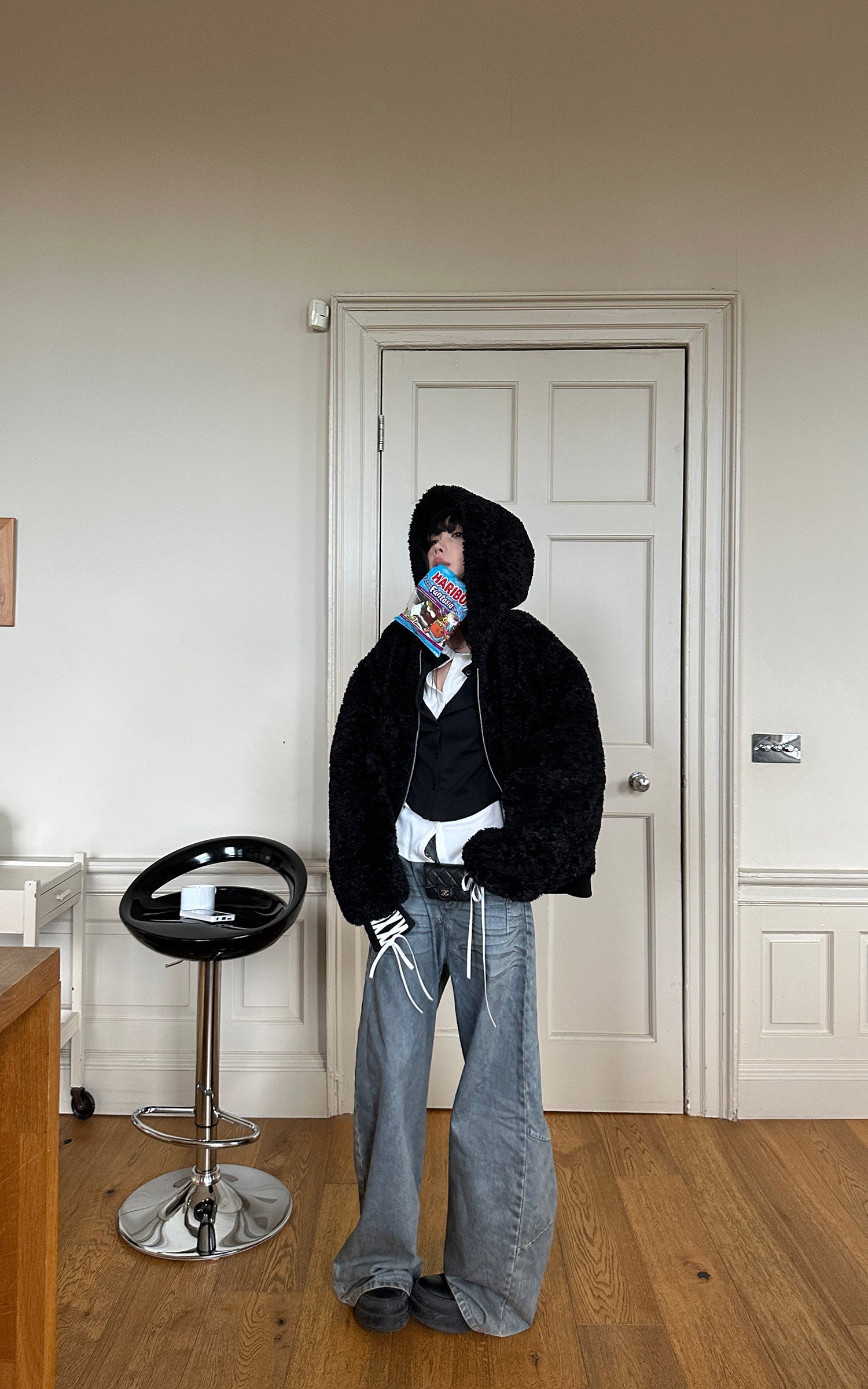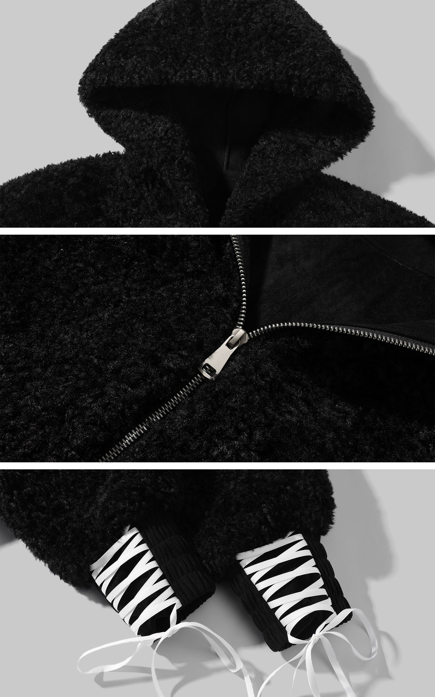 Soft yet structured. this textured fleece jacket amplifies volume and warmth with an oversized hood and a cocooned silhouette. The plush surface creates a bold. tactile contrast against the clean metal zipper. while the lace-up cuffs introduce a subtle deconstructed edge. Designed for layering. it moves between indoor ease and outdoor utility. delivering a sculptural street–ready look with quietly subversive attitude.