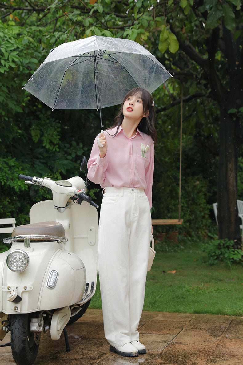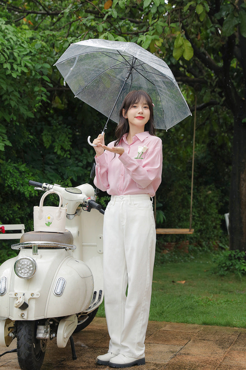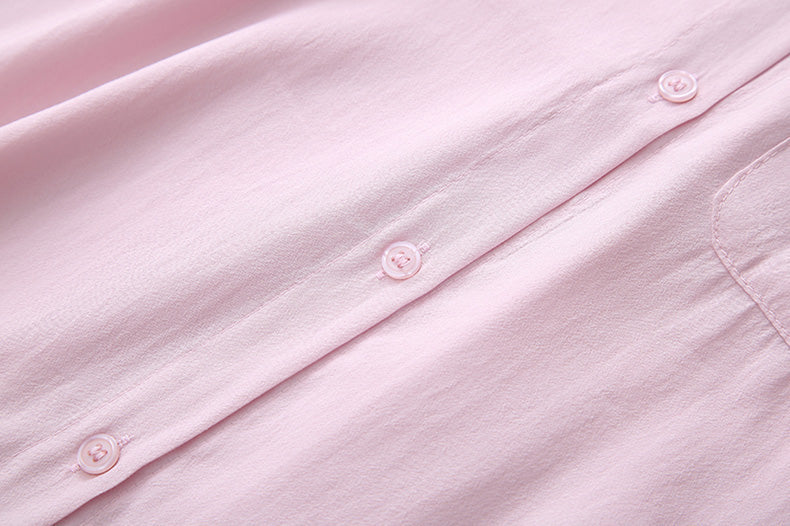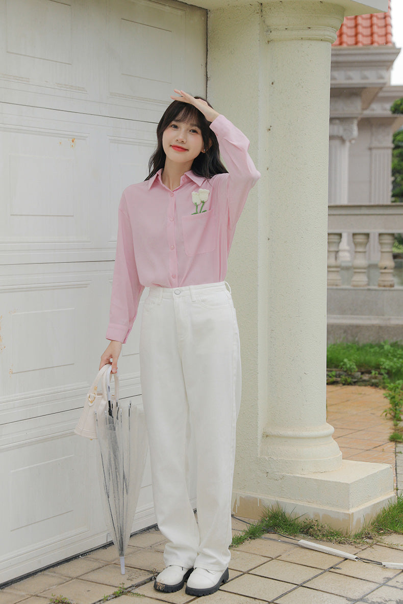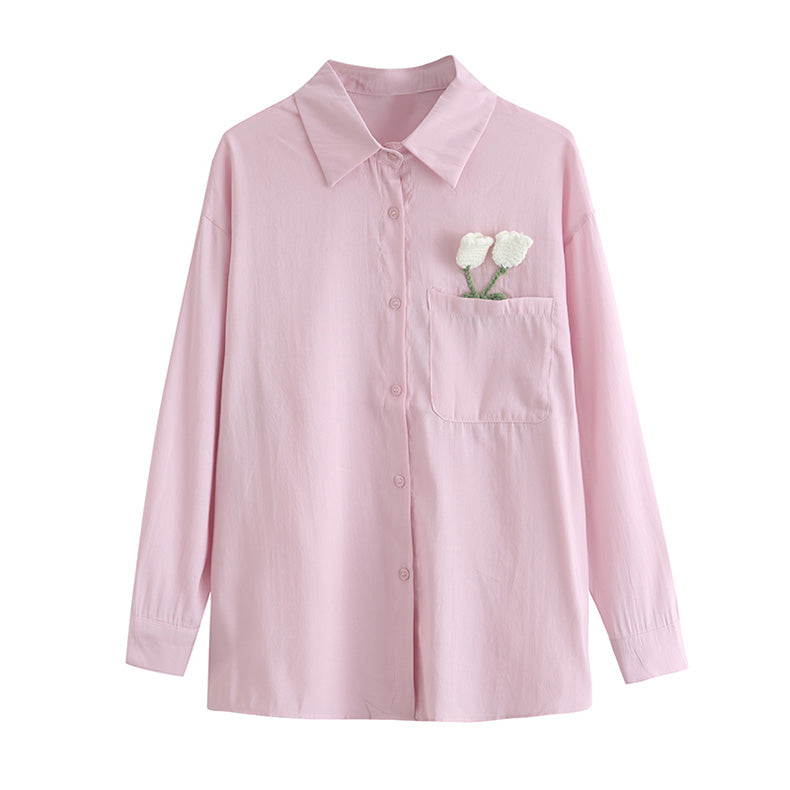 Long sleeve button up shirt with embroidered yarn tulips growing from the chest pocket.
