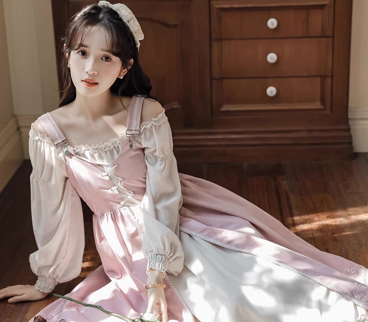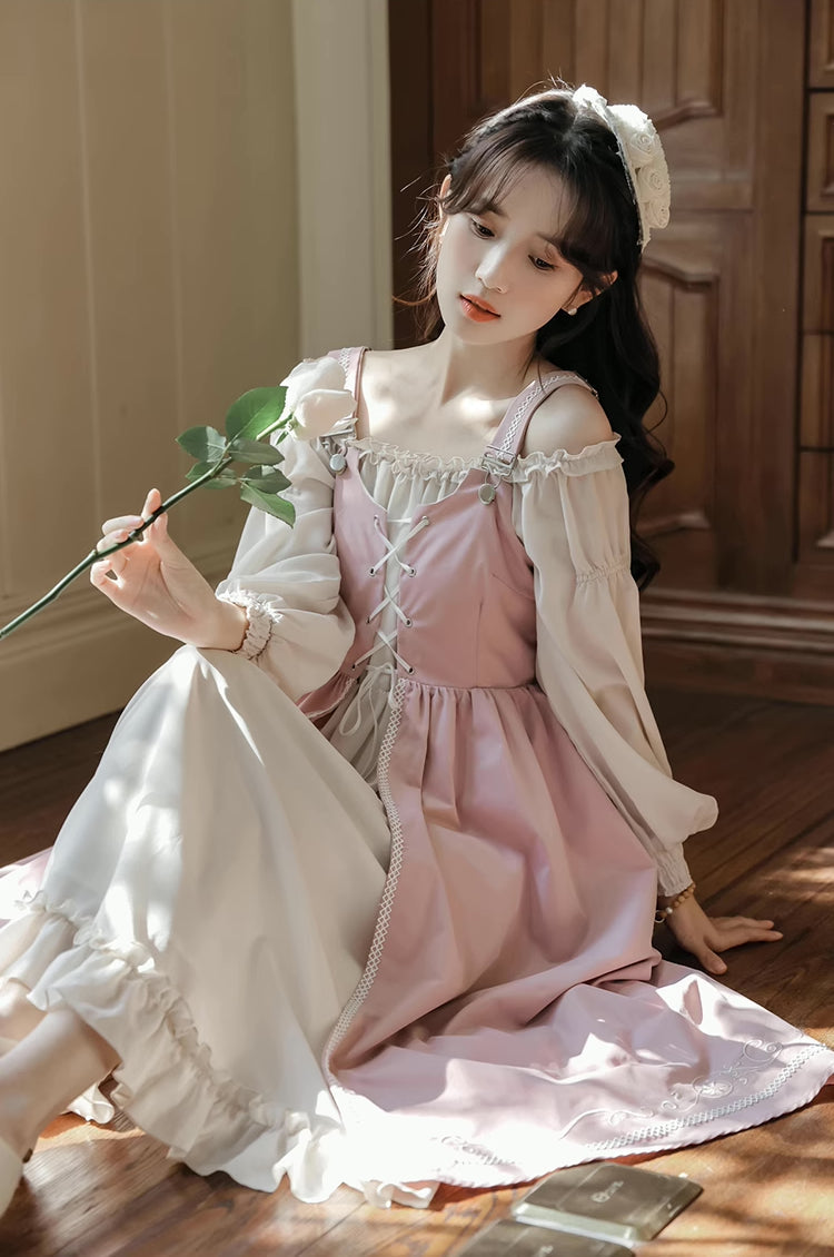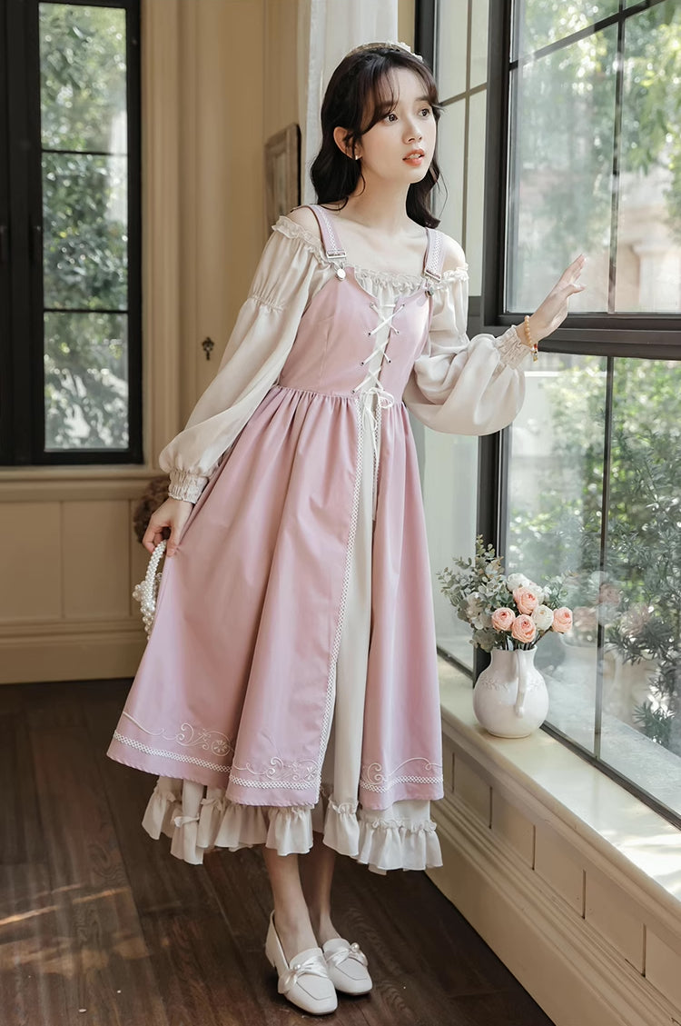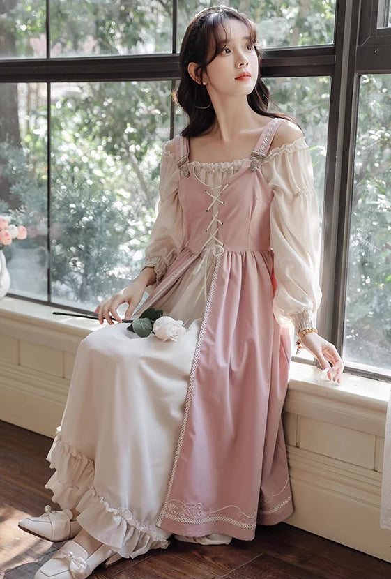 Medieval with a modern touch. This two-piece set consists of a basic off shoulder dress (which can be layered with anything else after that). long puff sleeves. ruffled neckline and hem. plus a lace-up corset dress piece with suspender straps and embroidery.