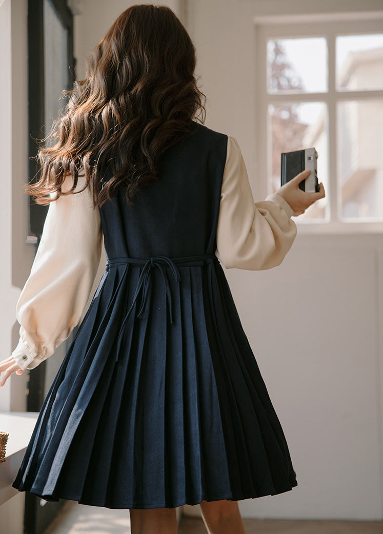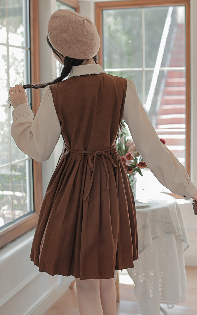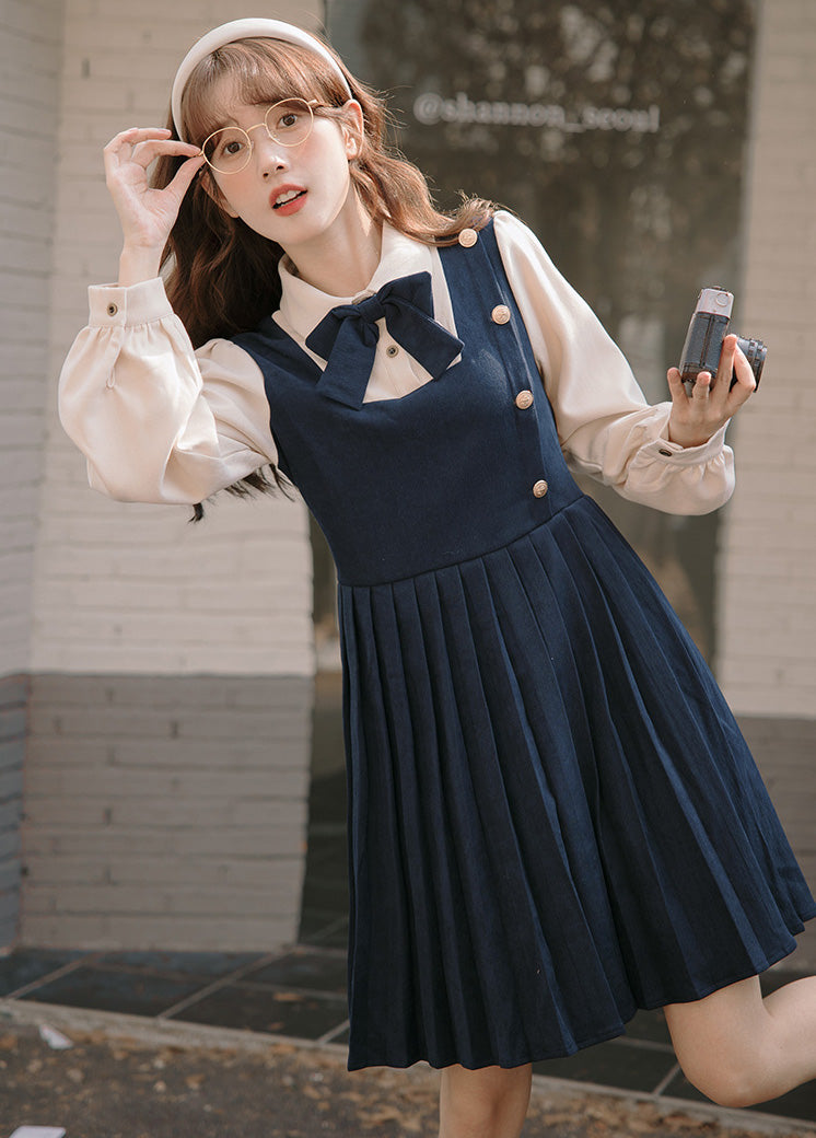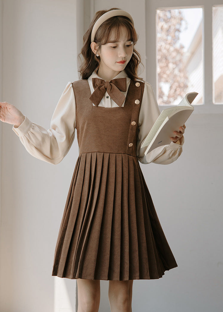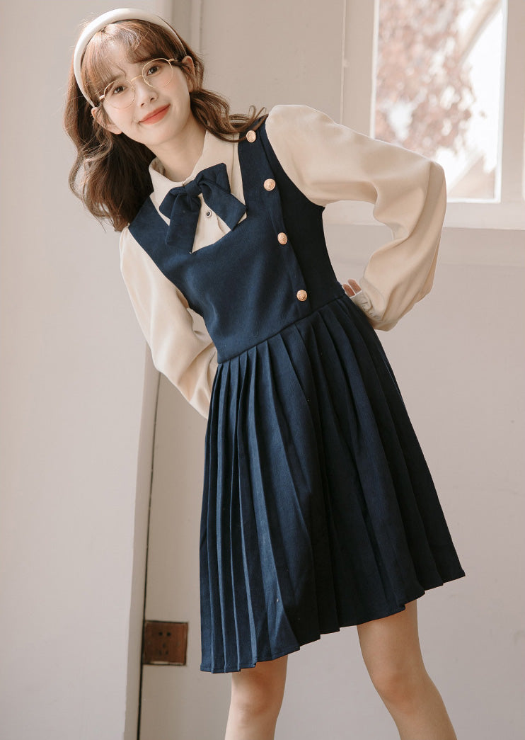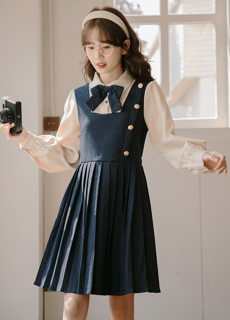 Sweet varsity uniform inspired short dress with a faux two-piece look. Features a corduroy suede bodice with button decorations on the side chest. pleated skirting and cute ribbon neck tie. Button up neckline with ties at the waist. Pull over construction.