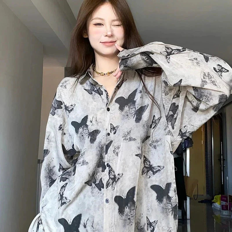 Vintage Harajuku Butterfly Print Shirt Women Y2K Oversized Single Breasted Female Shirt Streetwear Turn Down Collar Blouse Mujer