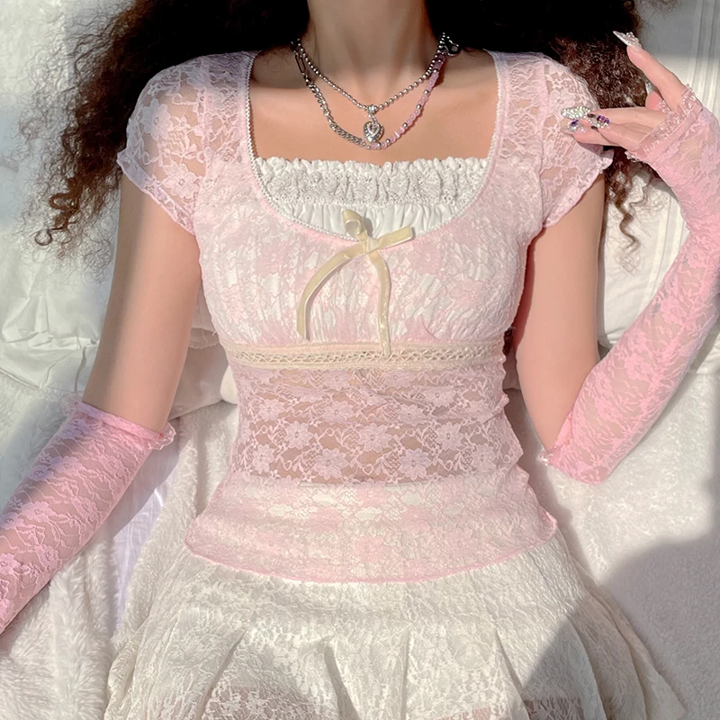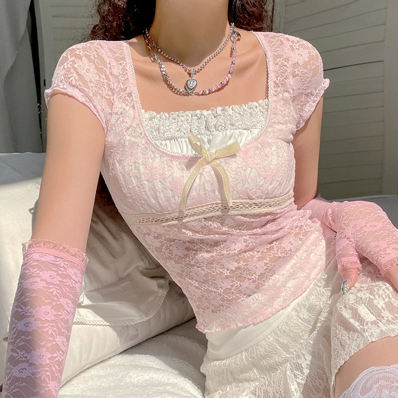 Bow Patchwork Lace Crop Top Y2K Aesthetic T-shirt Short Sleeve Kawaii Clothes Lolita Style Cute Pullovers Fairycore Tee