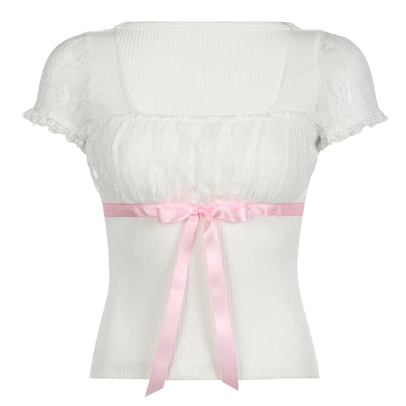 Coquette Contrast Bow Decorate Top Women's Summer Y2K Slim-fitting Puff Sleeve T-shirt Cute Japanese Lace Patchwork Tee