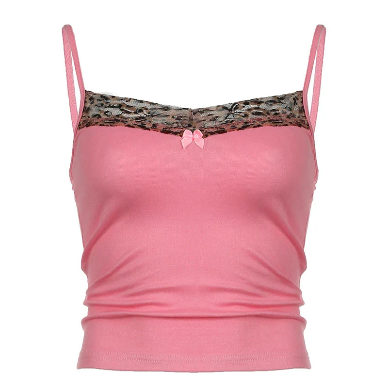 Coquette Contrast Leopard Print Patchwork Cami Women Y2K Aesthetic Bow Appliques Spaghetti Straps Tops Sexy Slim-fit