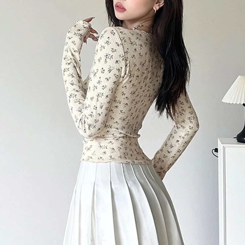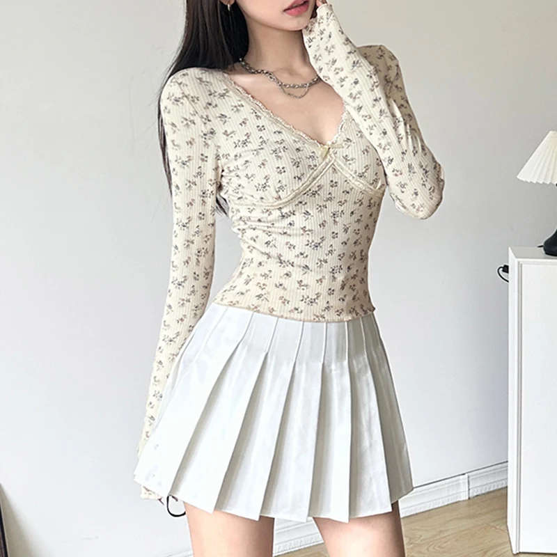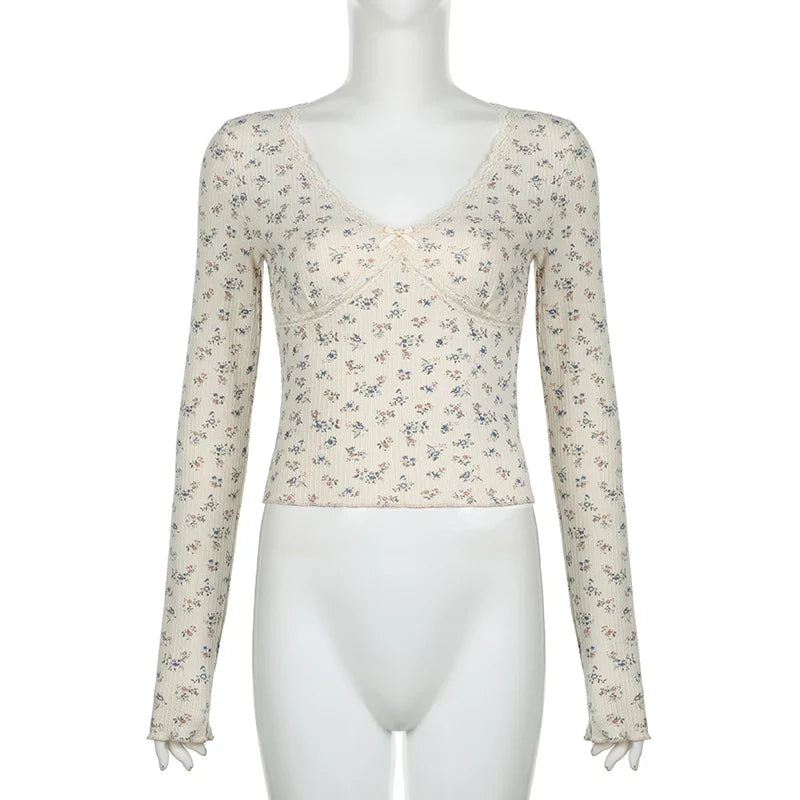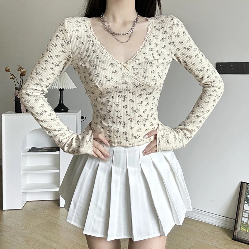 French Style Floral Print Knitted Tops Beige Color Lace Stitching V-neck Milkmaid T-shirt Autumn Cute Coquette Tees Y2K
