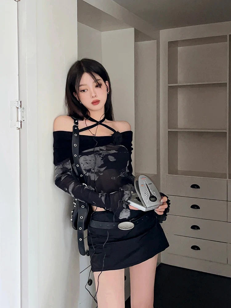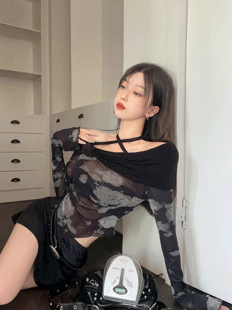 Harajuku Retro Tie Dye Mesh Tops Flare Sleeve Lace Up T Shirt Women Y2k Vintage Crop Tops Streetwear Japanese 2000s E Girls Top