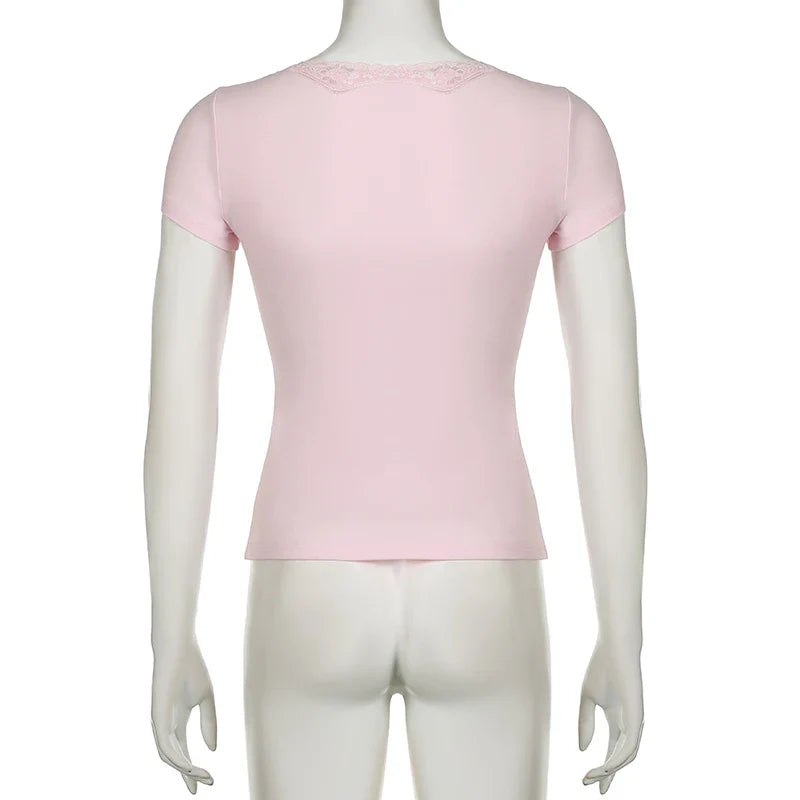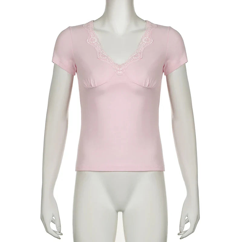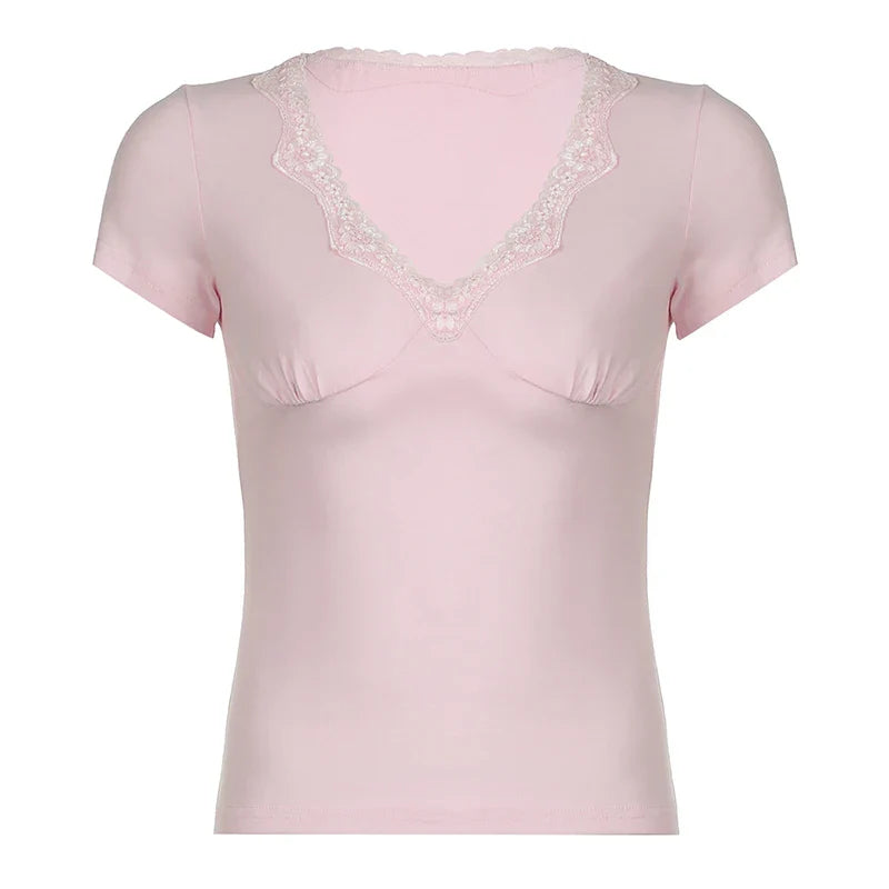 Kawaii Lace Patchwork V-neck Top Pink Casual Basic Short Sleeve T-shirts Sweet Japanese Style Y2K Slim-fitting Tees