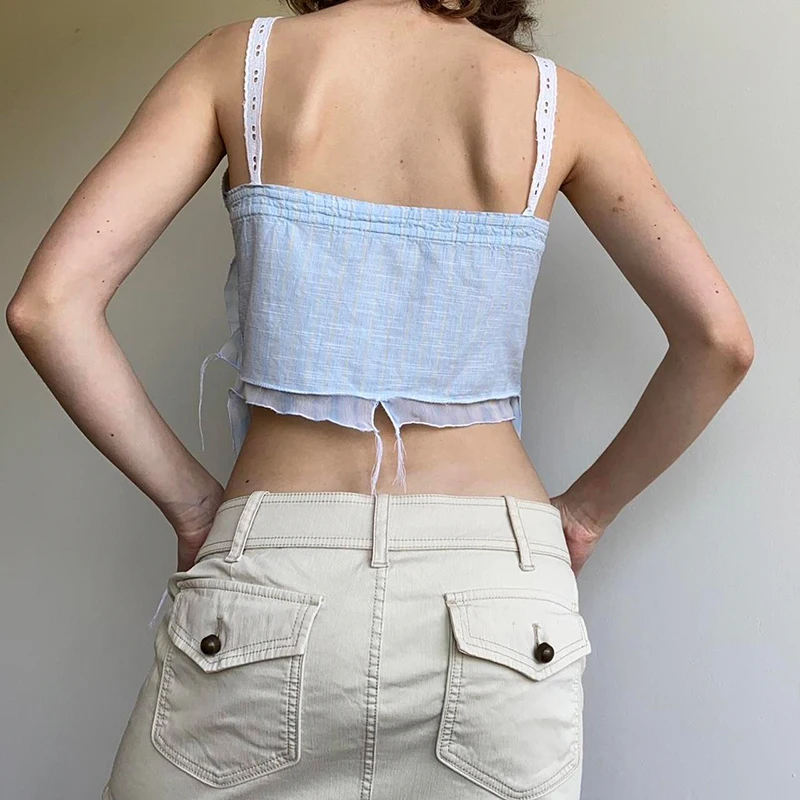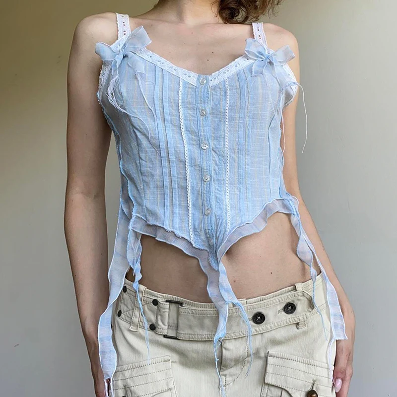 Kawaii Lace Stitching V-neck Striped Irregular Crop Top Baby Blue Fairy Button-up Sleeveless Top Y2K Japanese Style Top