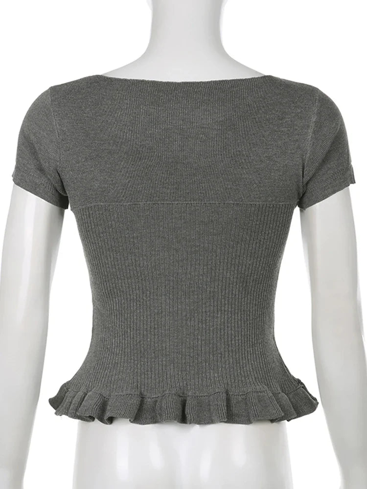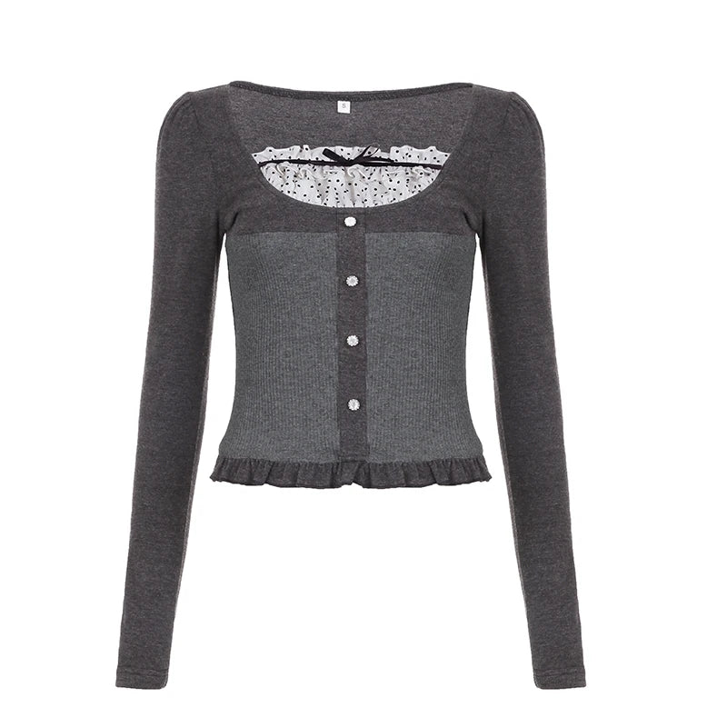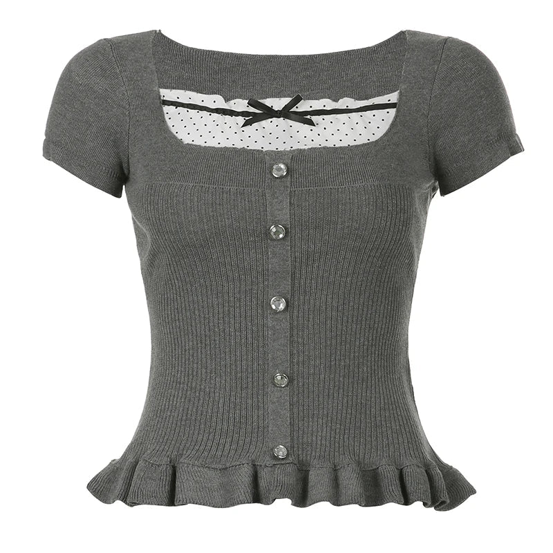 Ribbons Bow Contrast Patchwork T-shirt Y2K Aesthetic Button Up Frill Casual Basic Crop Top Kawaii Lolita Tops Cute Tees