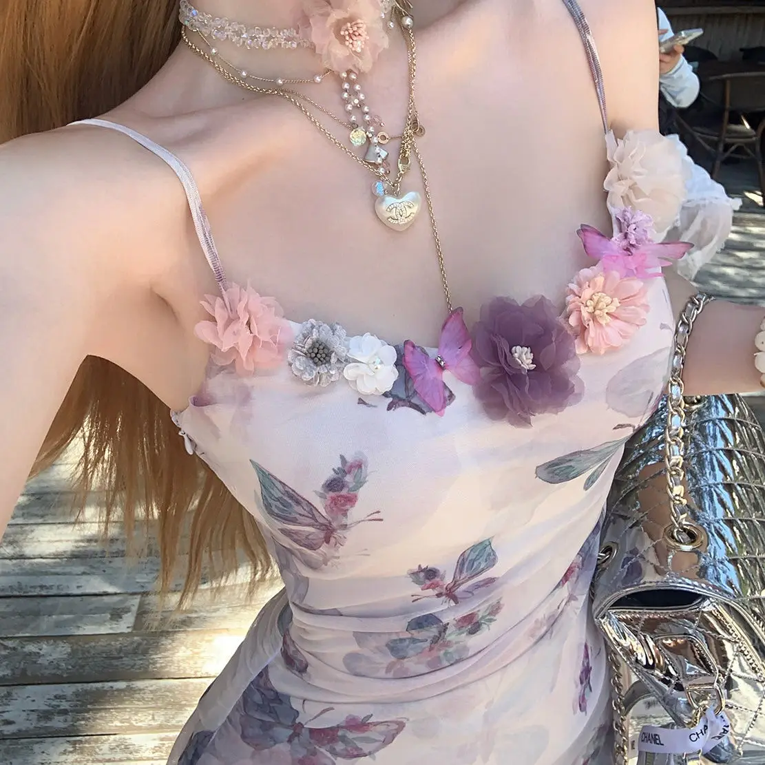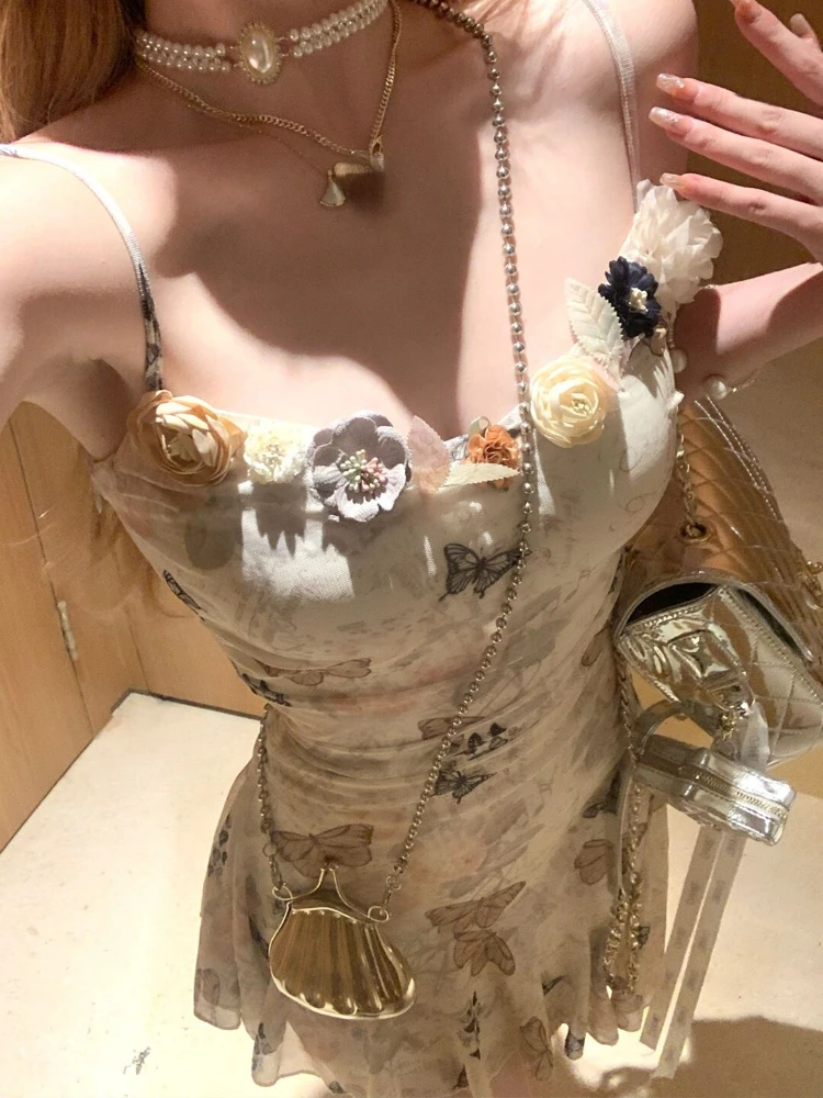 Sweet Floral Party Mini Dress Women Summer New Korean Printing Floral Y2k Dress Female Slim Chic Strap Beach Designer Dress