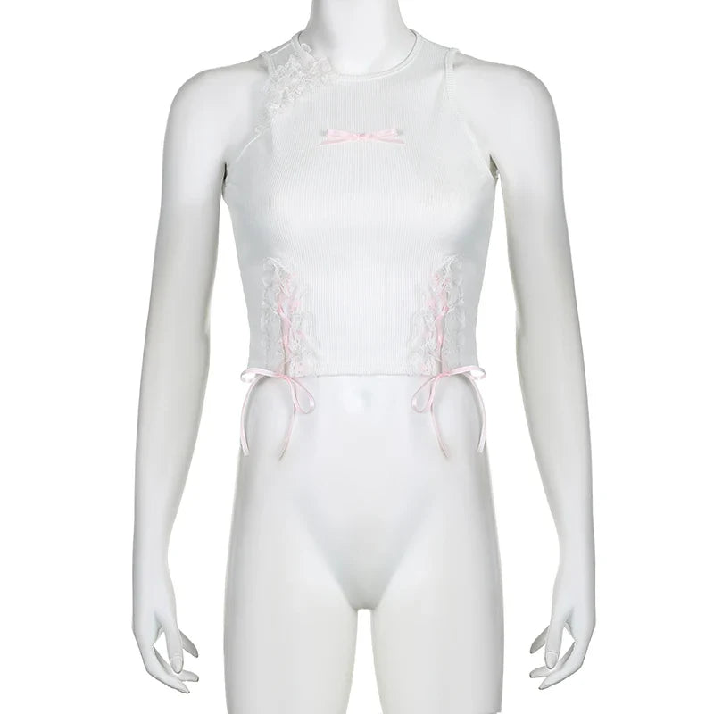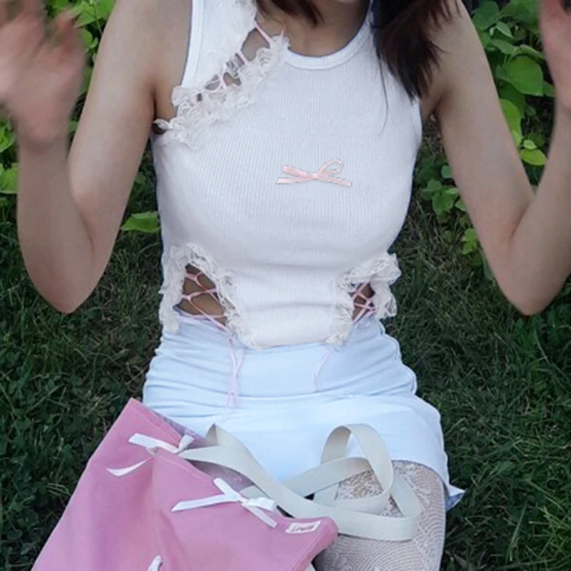 Sweet Lace Stitching Hollow Out Tank Top Women Cute Bow Bandage Sleeveless Crop Tops Y2K Casual Basic Vest Lolita Camis