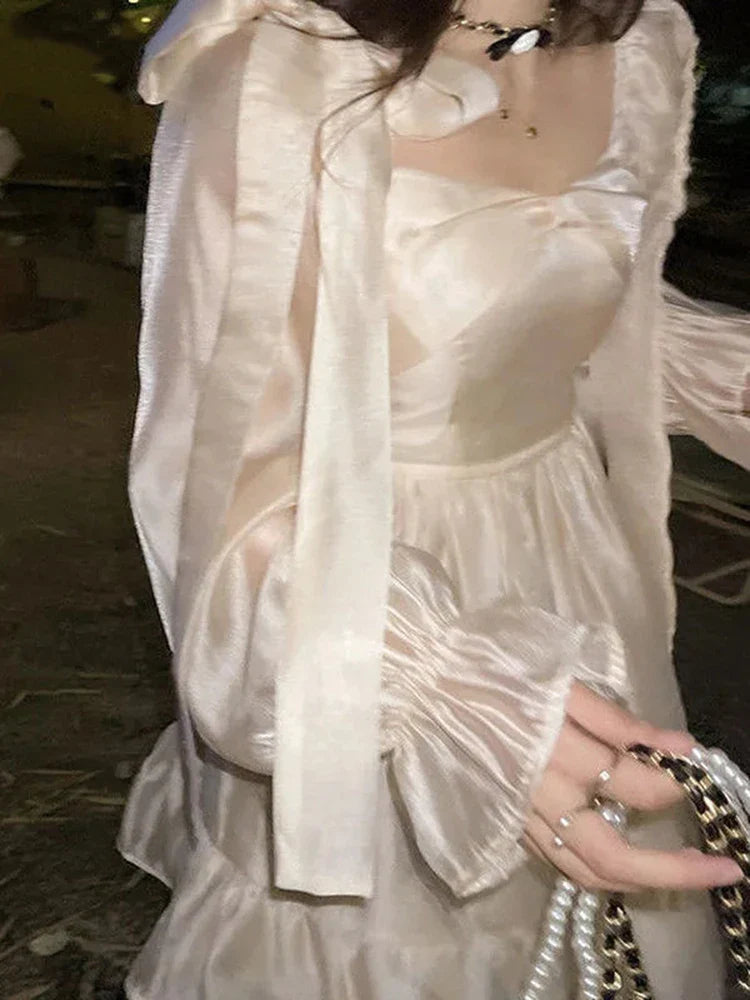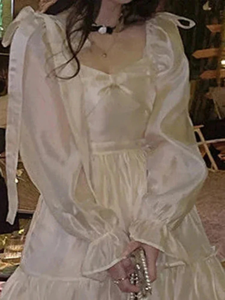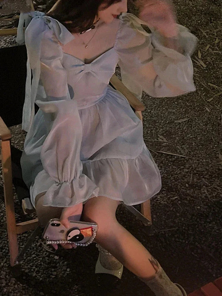 Winter Korean Fashion Long Sleeve Casual Lolita Dresses Female Vintage Y2K Beige Mini Dress Kawaii Blue One Piece Dress