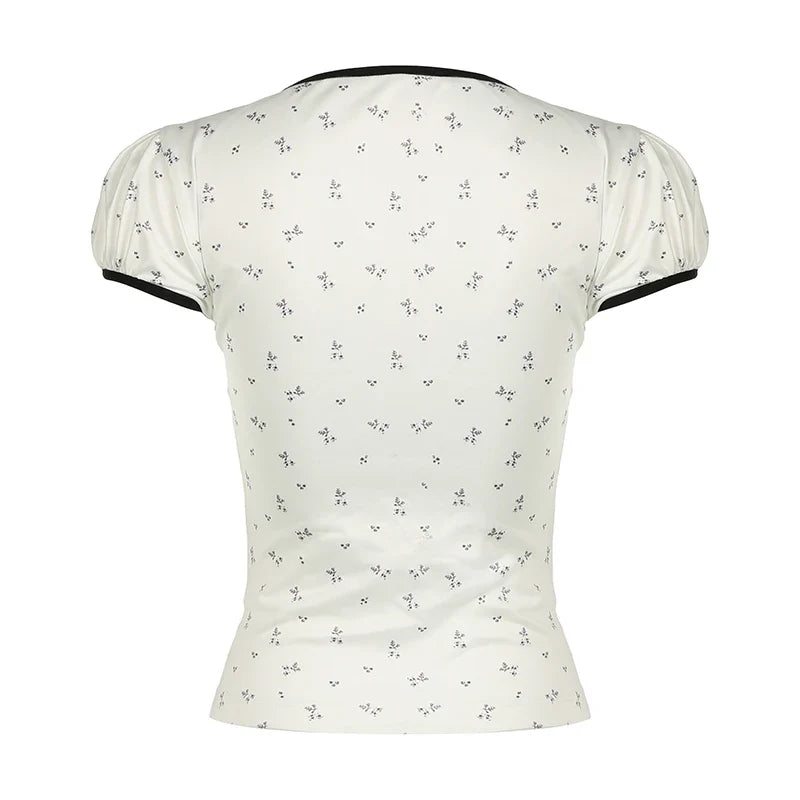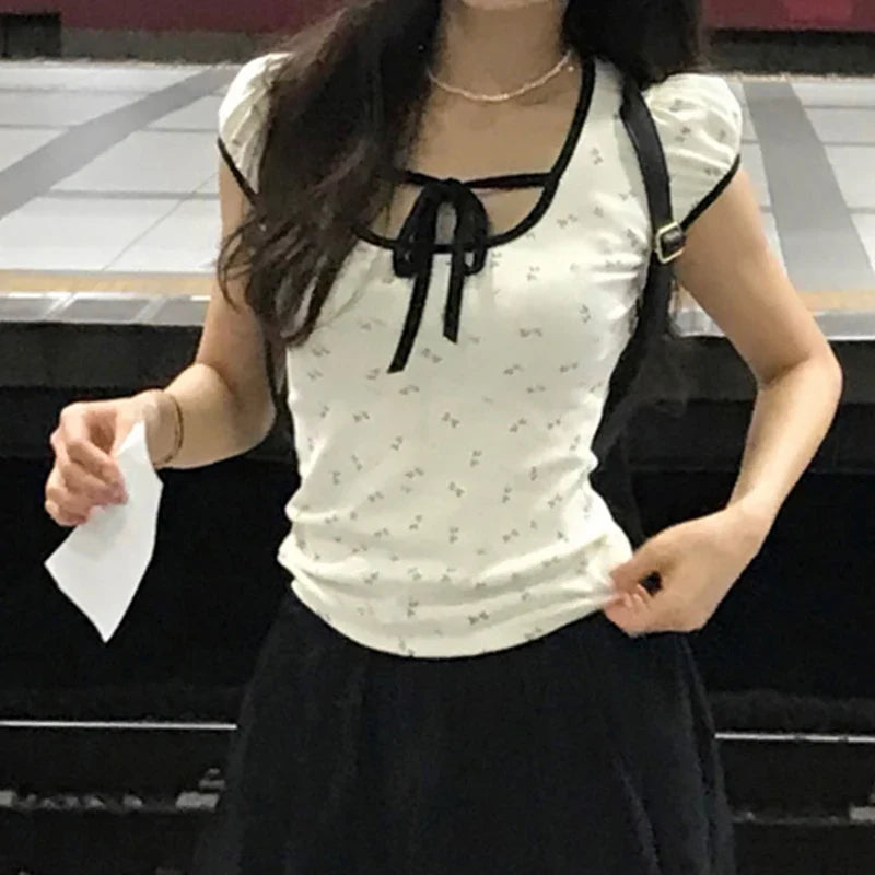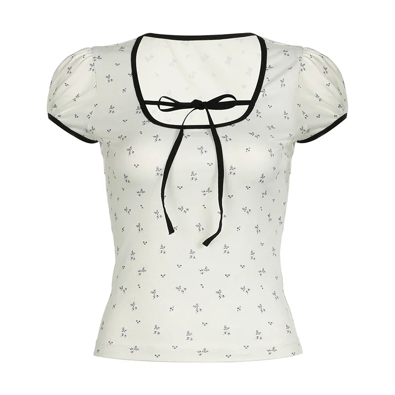 Y2K Floral Print T-shirt Women's Summer Contrast Color Lace-up Square Collar Short Sleeve Tops French Style Cute Tees