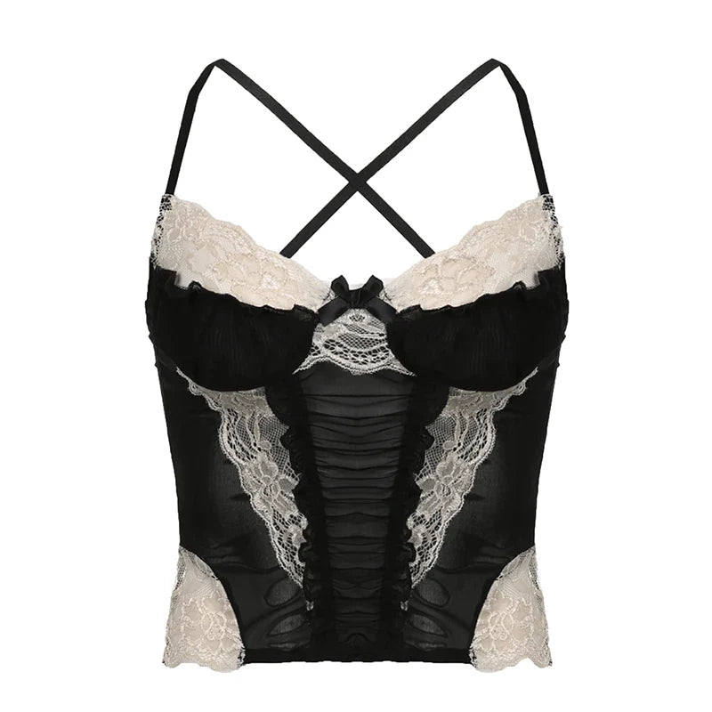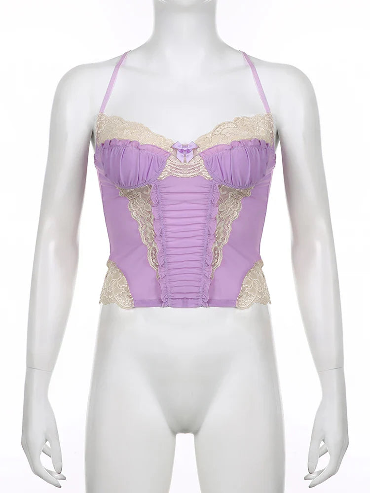 y2k Lace Patchwork Purple Coquette Mesh Corset Women Sexy Backless Criss-cross Halter Camis Sweet Aesthetic Crop Top