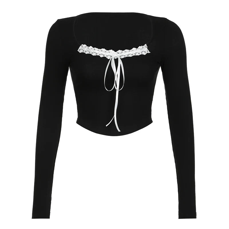 Y2K Lace Ribbons Lace-up Bow Cropped Top Pink Cute Casual Basic Irregular Knitted Tops Coquette Aesthetic Slim-fit Tees