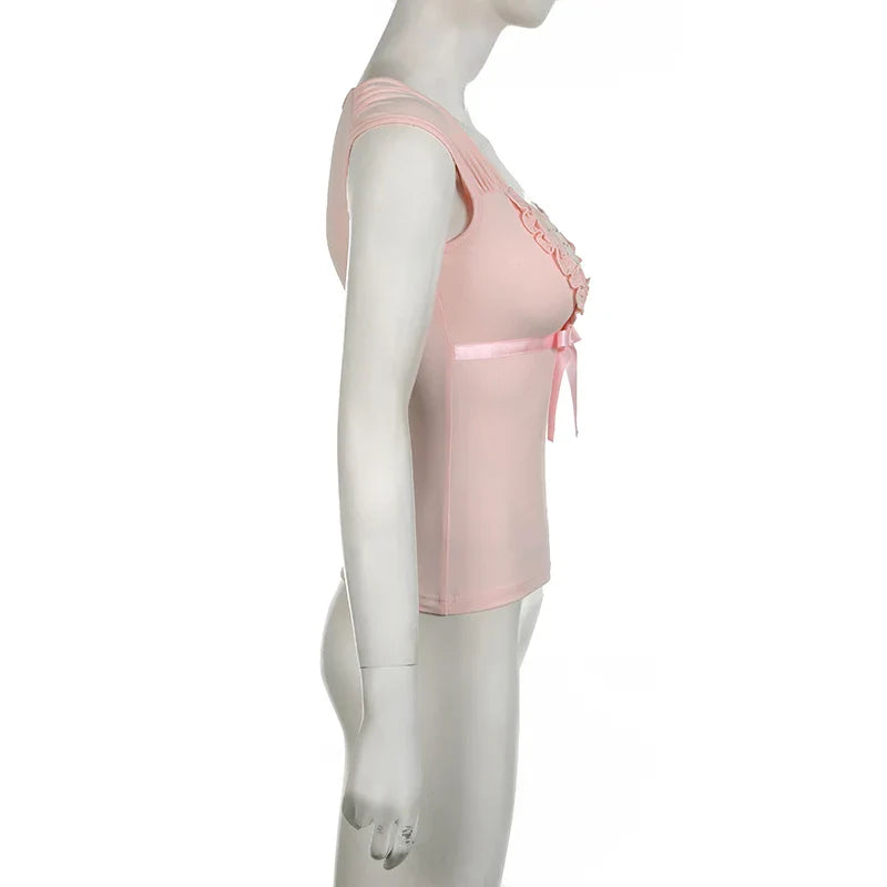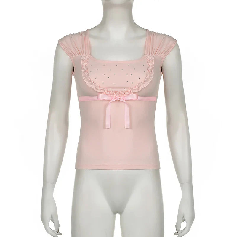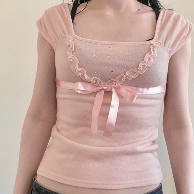 Y2K Rhinestone Frill Edge Bow T-shirt Pink Kawaii Japanese Lolita Casual Square Collar Short Sleeve Top Coquette Tees