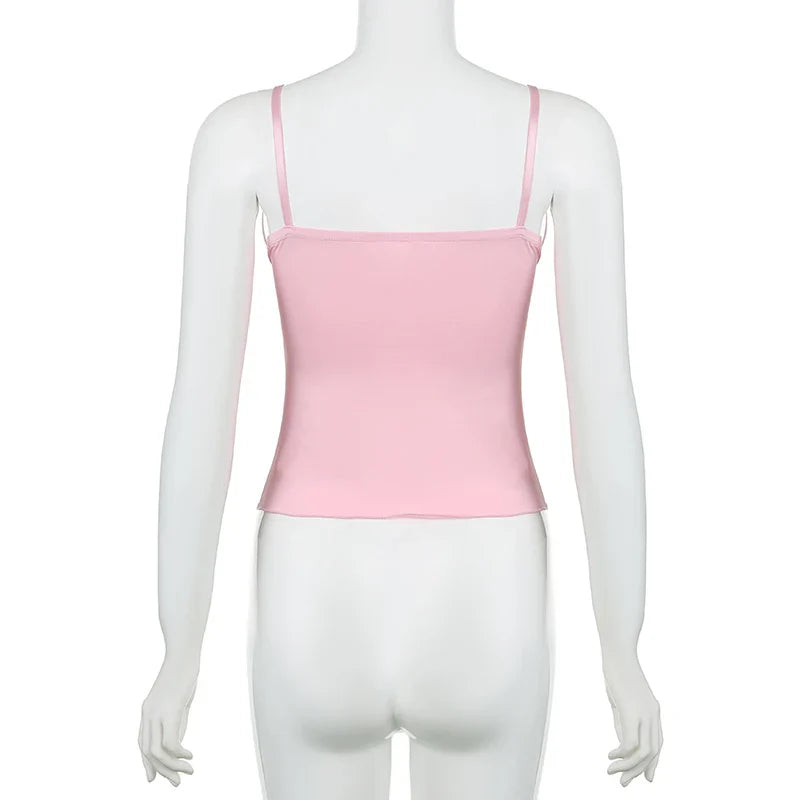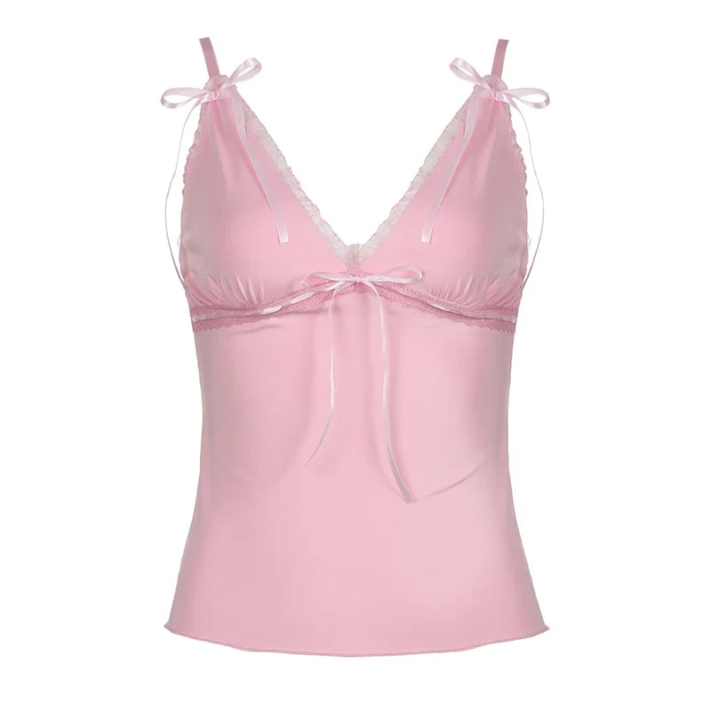 Y2K Ribbons Bow Lace Patchwork Crop Top Pink Coquette Aesthetic Slim-fit V-neck Camis Ruched Kawaii Lolita Corset Women