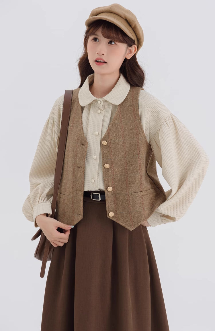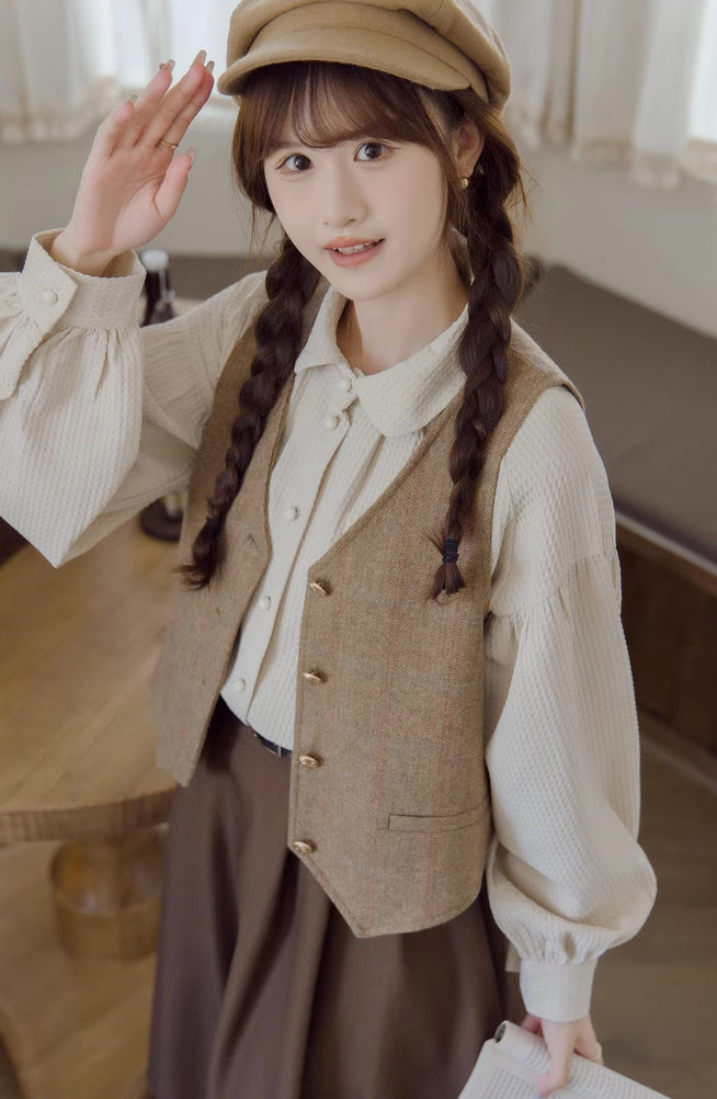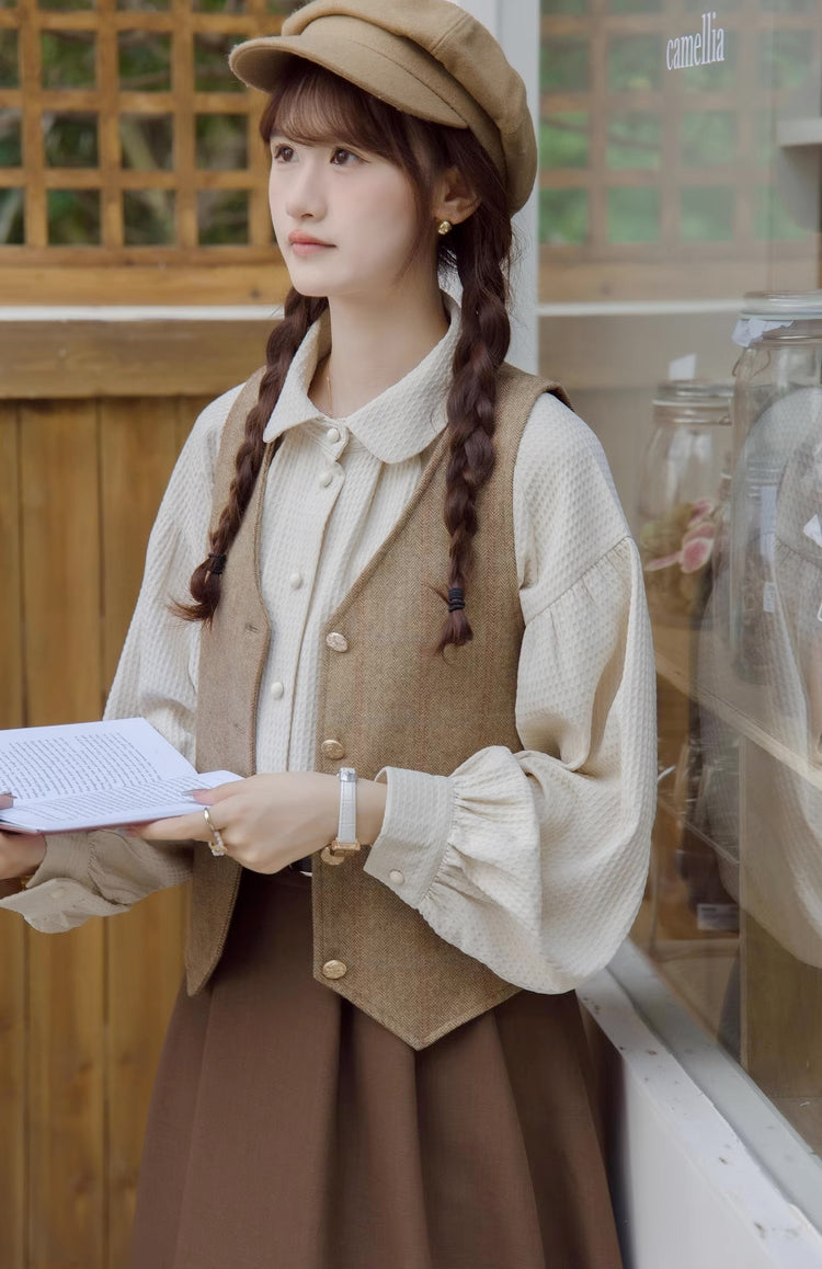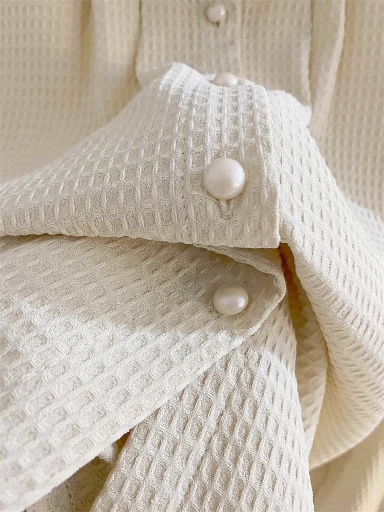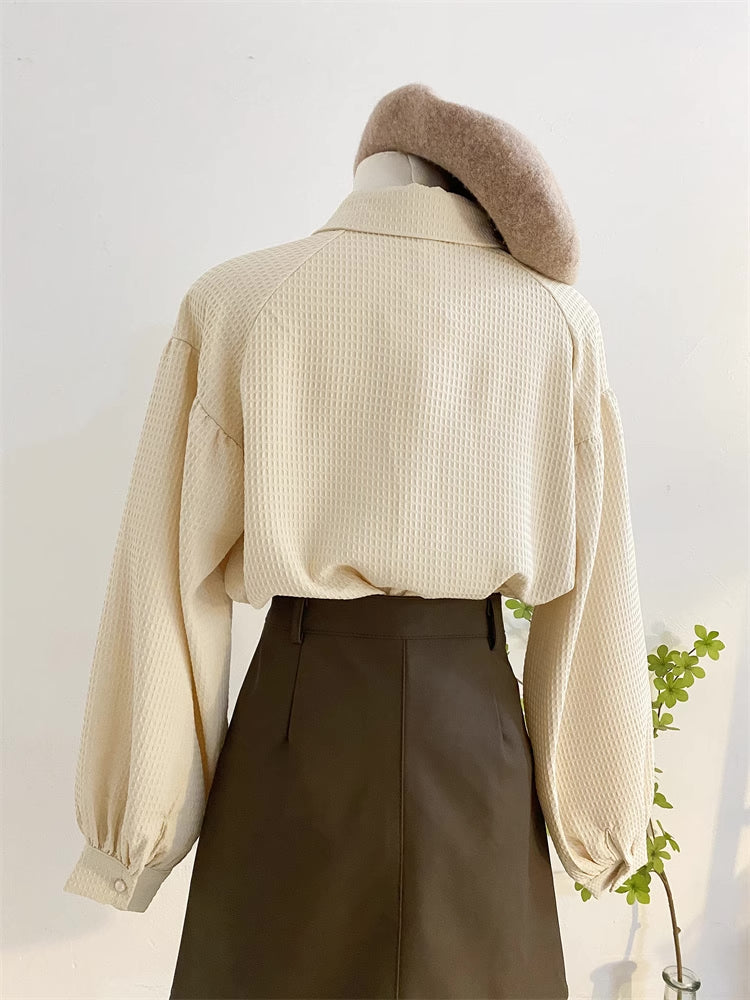 Waffle texture blouse with a peter pan collar. button down front. drop shoulders and long puff sleeves.
