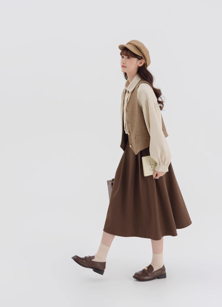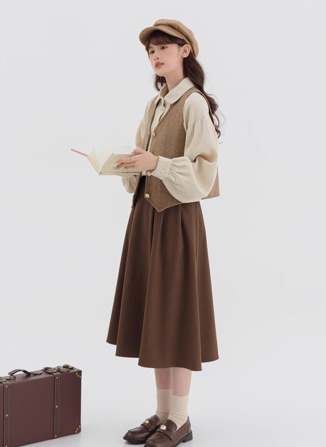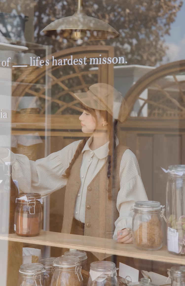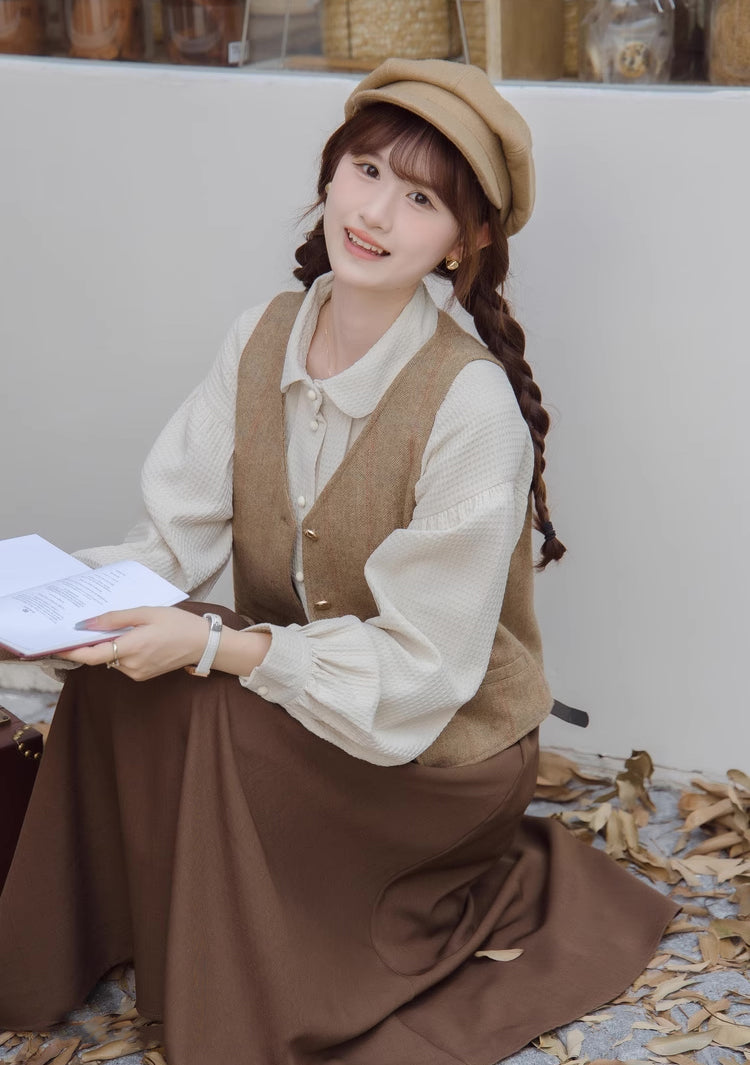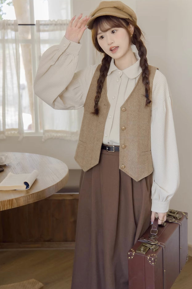 Waffle texture blouse with a peter pan collar. button down front. drop shoulders and long puff sleeves.