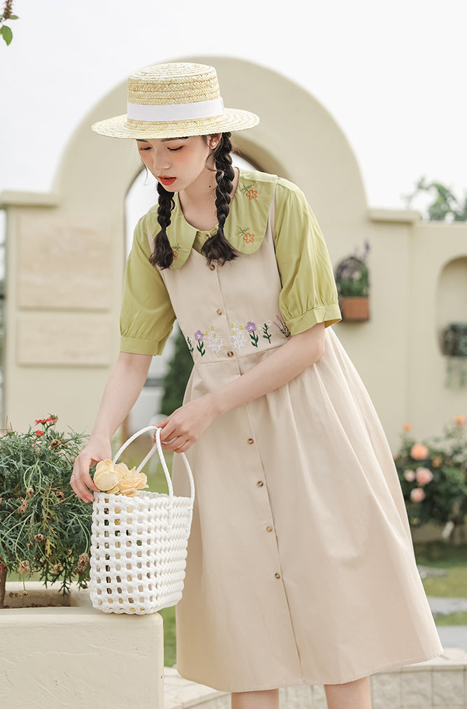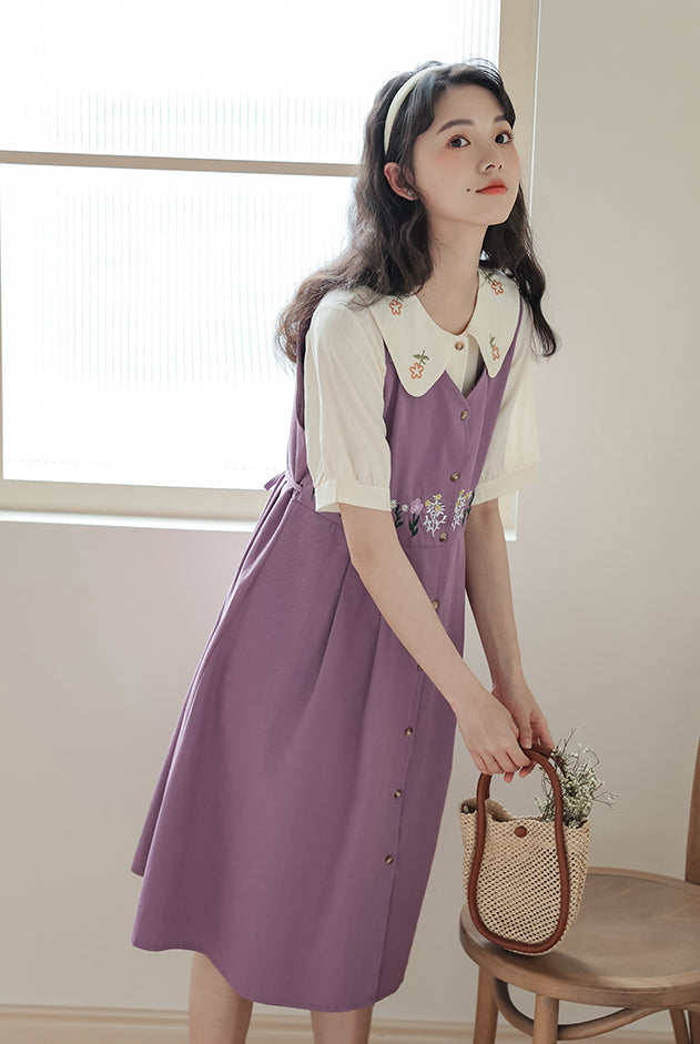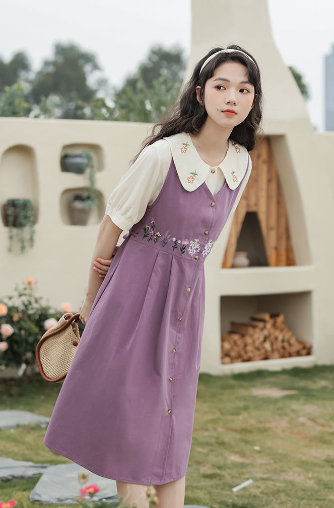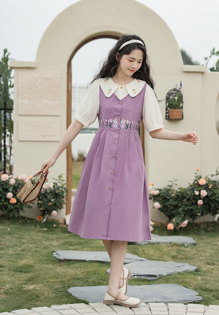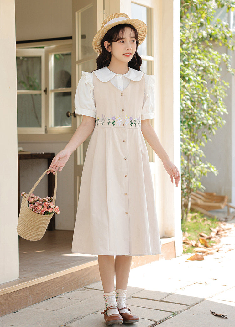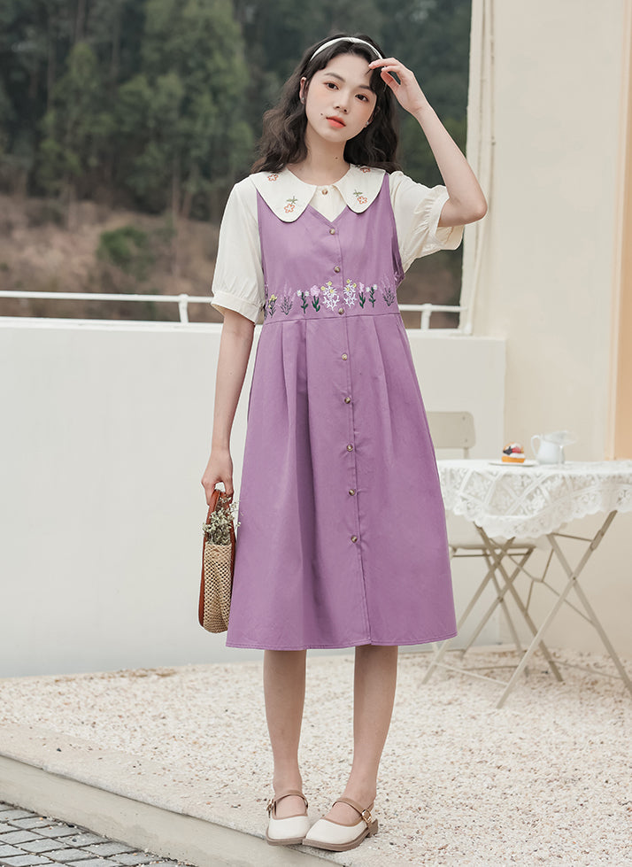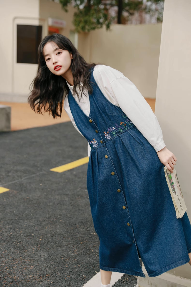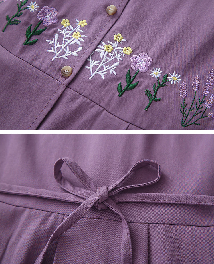 Button down dress with a v-neckline and wide sleeve holes for layering with your favorite blouses and sweaters. Embroidered wildflowers along the waistline with waist ties. Midi length.