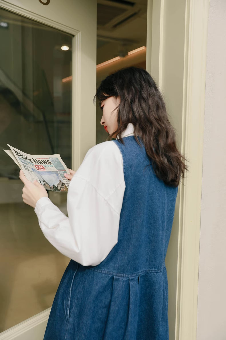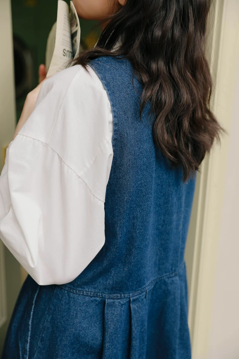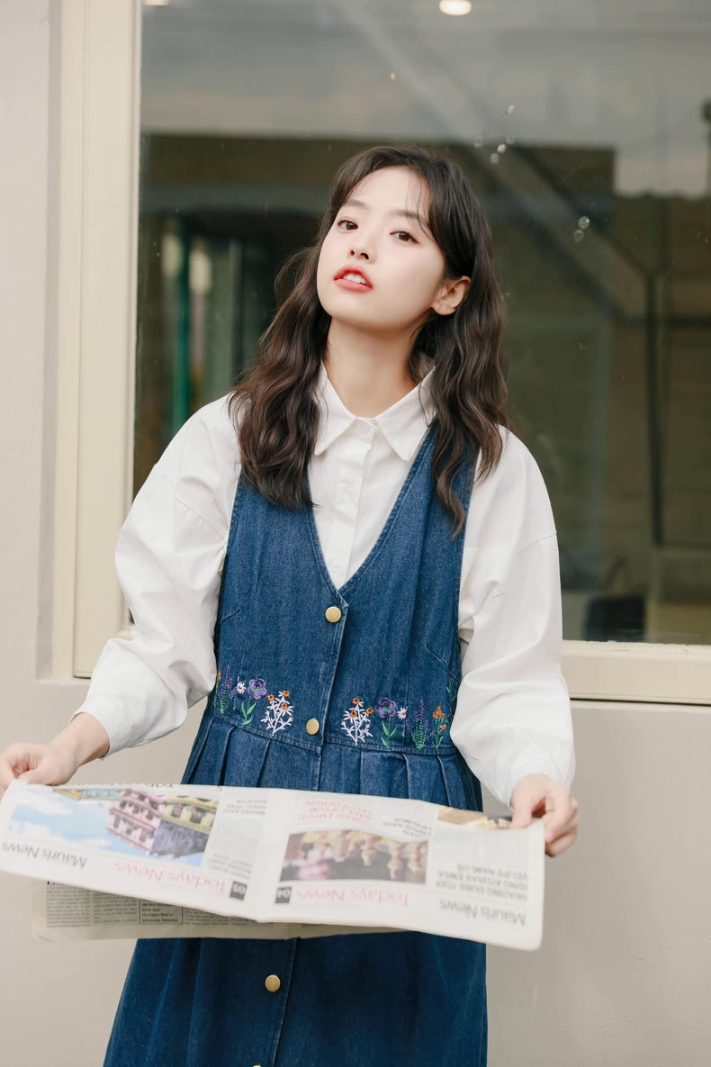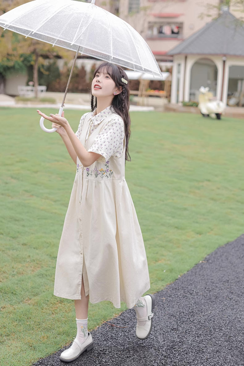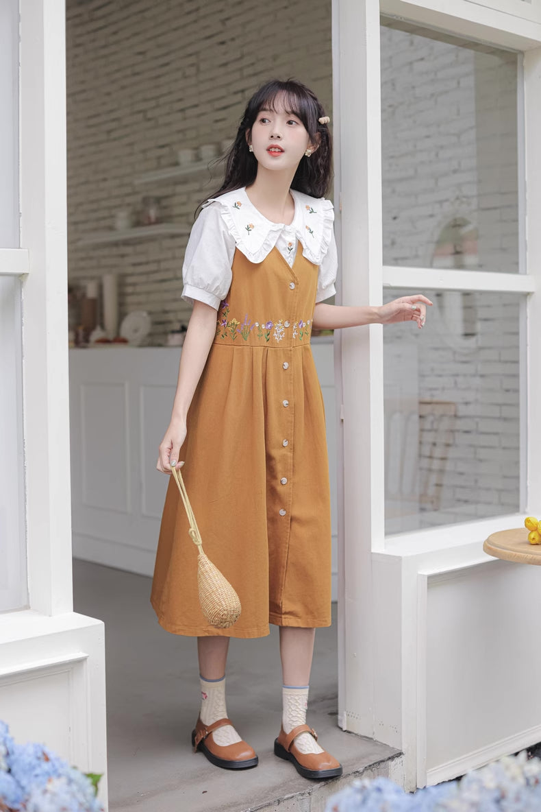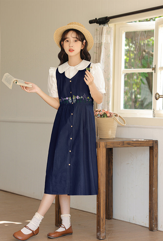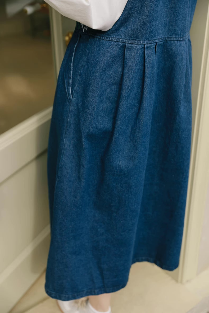 Button down dress with a v-neckline and wide sleeve holes for layering with your favorite blouses and sweaters. Embroidered wildflowers along the waistline with waist ties. Midi length.