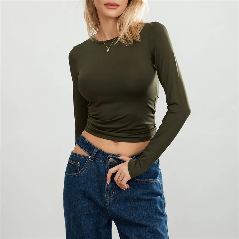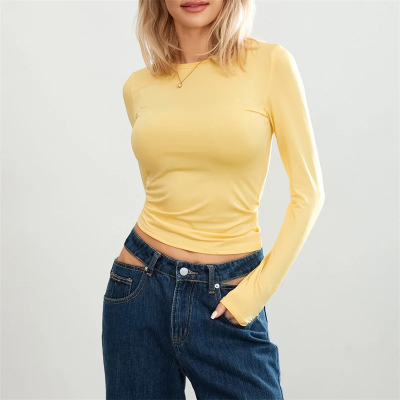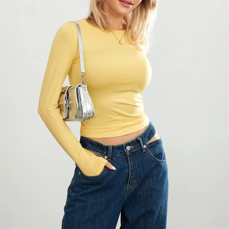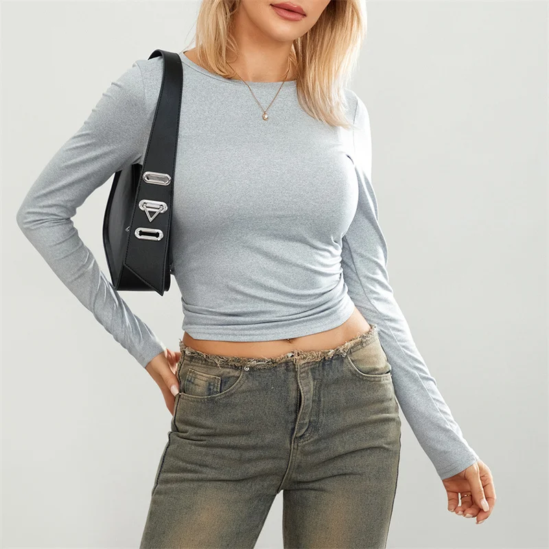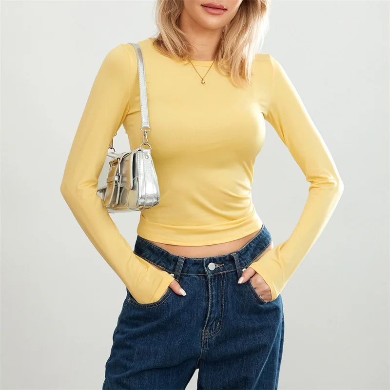 y2k Crop Tops Women Spring Autumn Solid Color Round Neck Long Sleeve Tshirt 2000s Tees Casual Clothing Streetwear