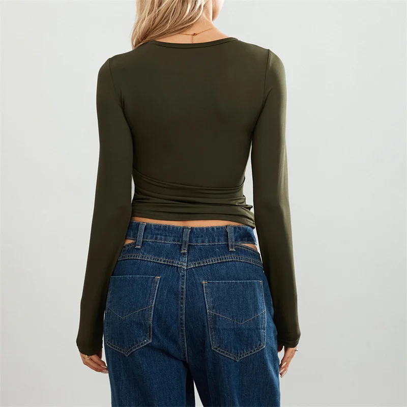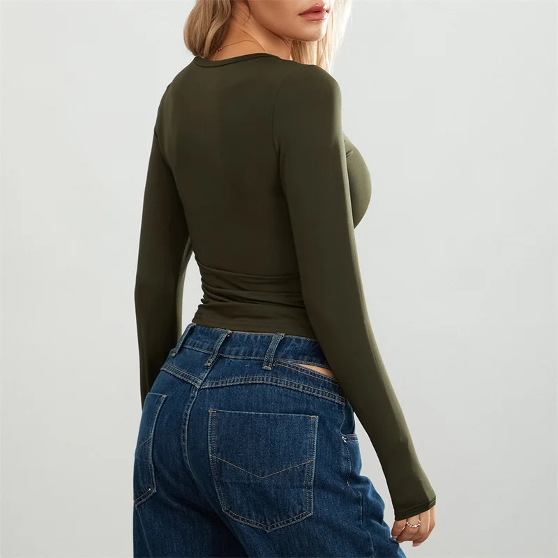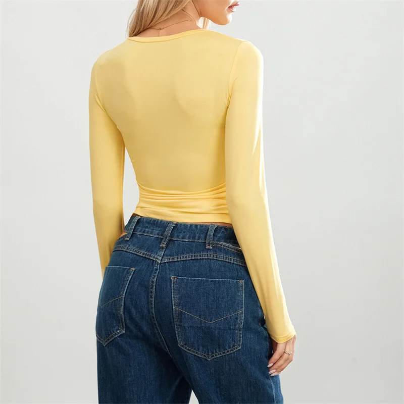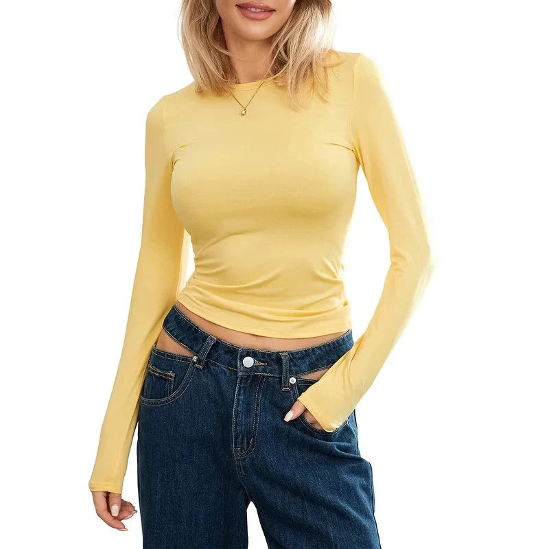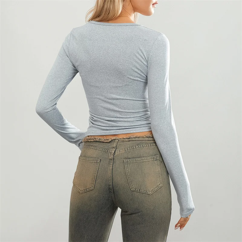 y2k Crop Tops Women Spring Autumn Solid Color Round Neck Long Sleeve Tshirt 2000s Tees Casual Clothing Streetwear