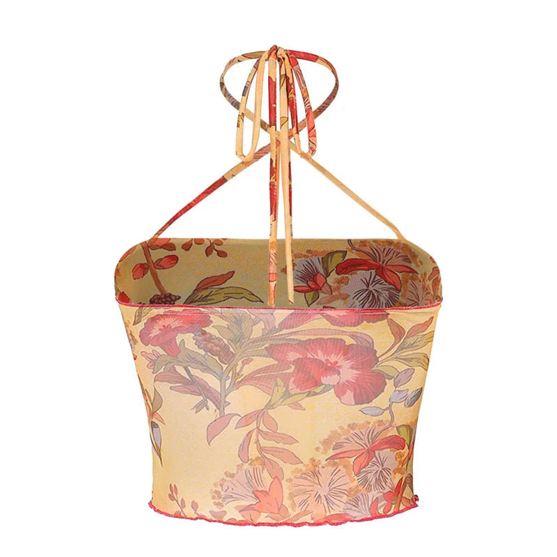 y2k Tops for Women Sheer Floral Print Slim Fit Spaghetti Strap Sleeveless Mesh Halter Vest 2000s Clothes Streetwear
